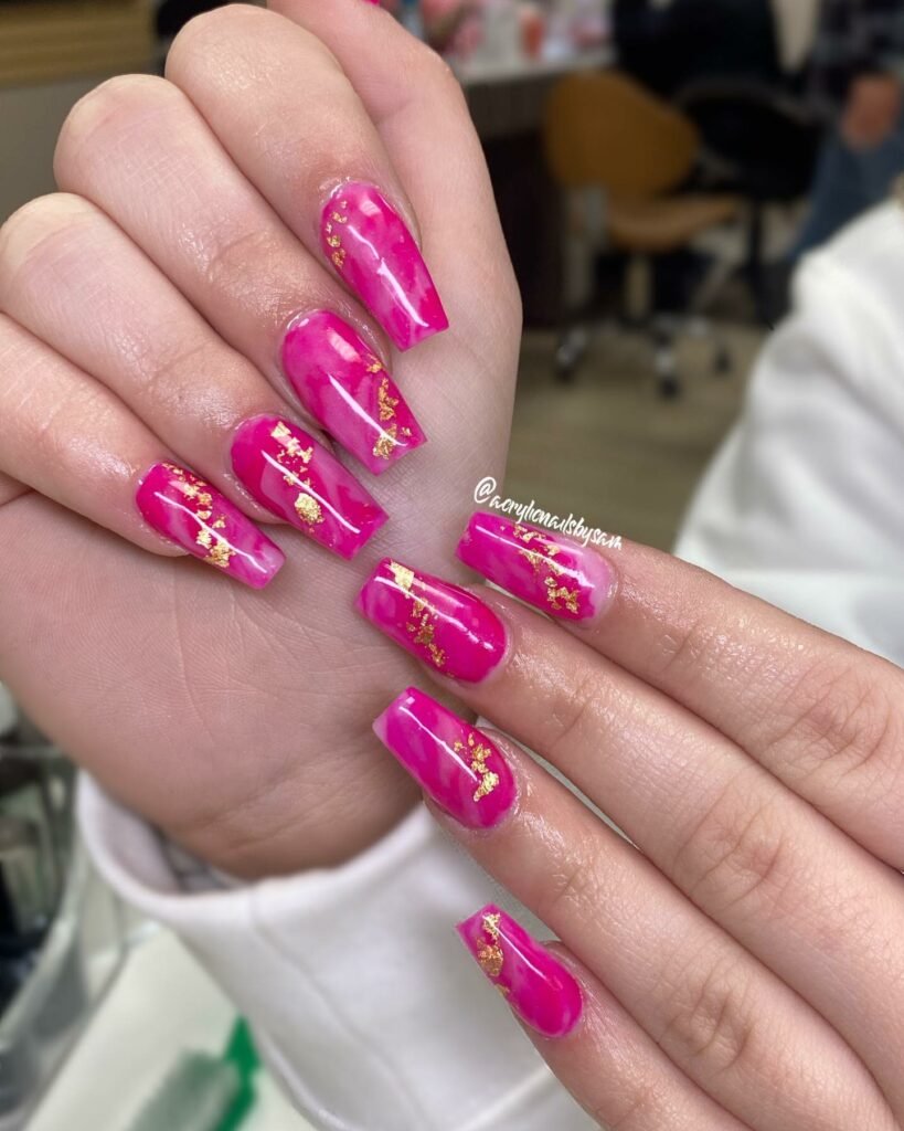 This bold magenta moment is pure confidence — loud in the best way, glossy like hard candy, and kissed with flecks of gold that feel almost jewel-like. The marble effect brings in movement and depth, making every nail feel like its own tiny artwork.