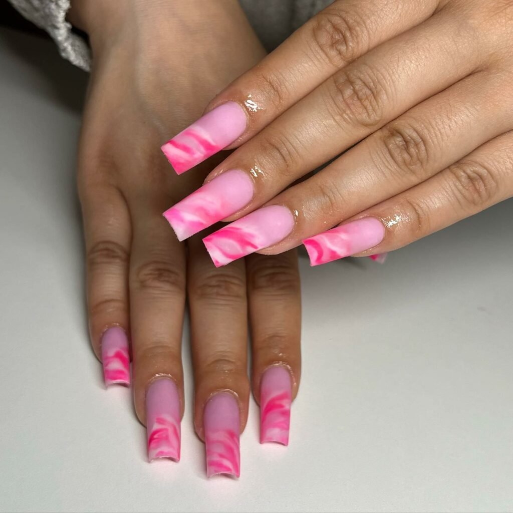@prizdidmynailz keeps it matte, modern, and beautifully blended. The pink marble tips float perfectly over that nude base, creating a smooth transition that feels almost airbrushed.