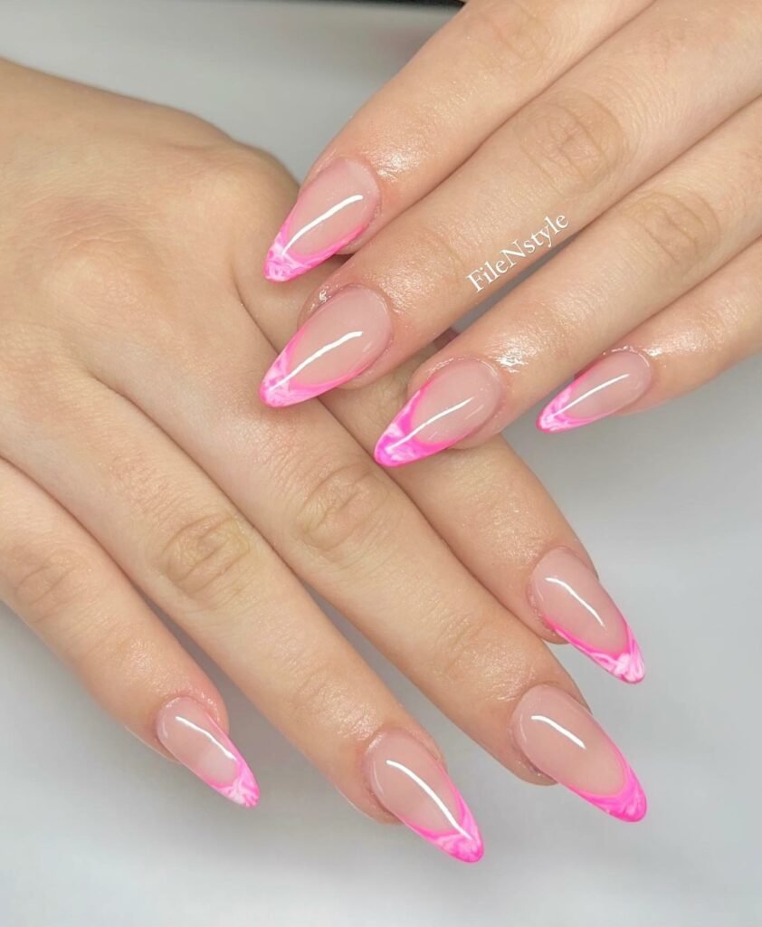 A sharp almond silhouette mixed with bright pink marble tips makes this set feel fresh, cheeky, and a little futuristic. The nude base keeps everything refined, while the vibrant marbling adds a punch of personality.