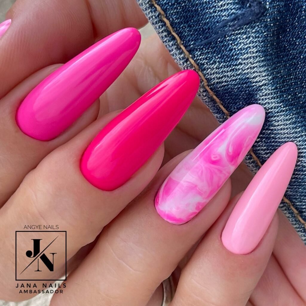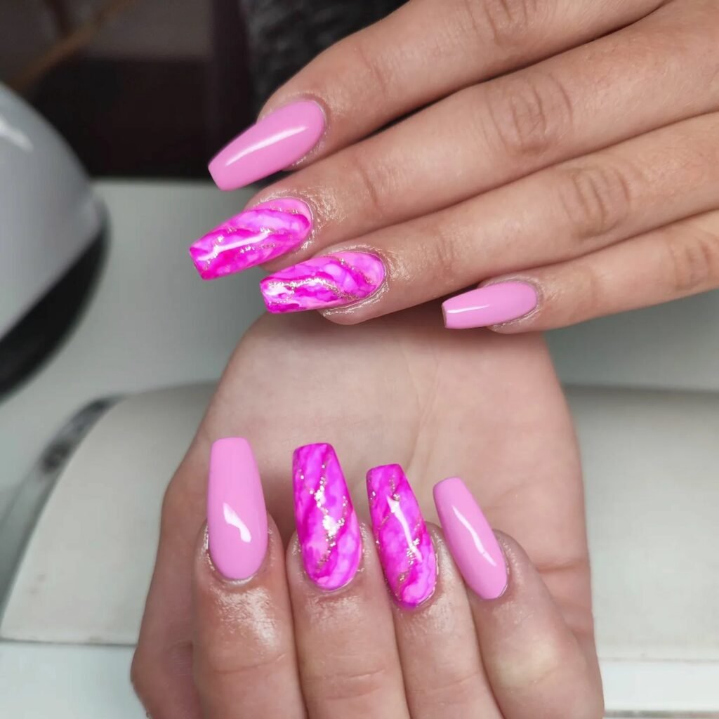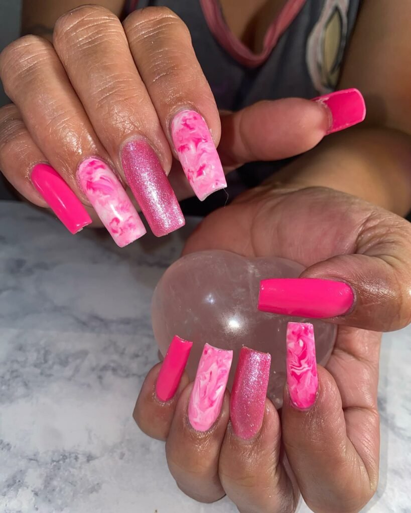 These elongated, ultra-glossy nails bring the energy — a mix of creamy bubblegum pink, bold fuchsia, and a swirling marble accent that ties the whole palette together. The finish is sleek, modern, and undeniably fun.