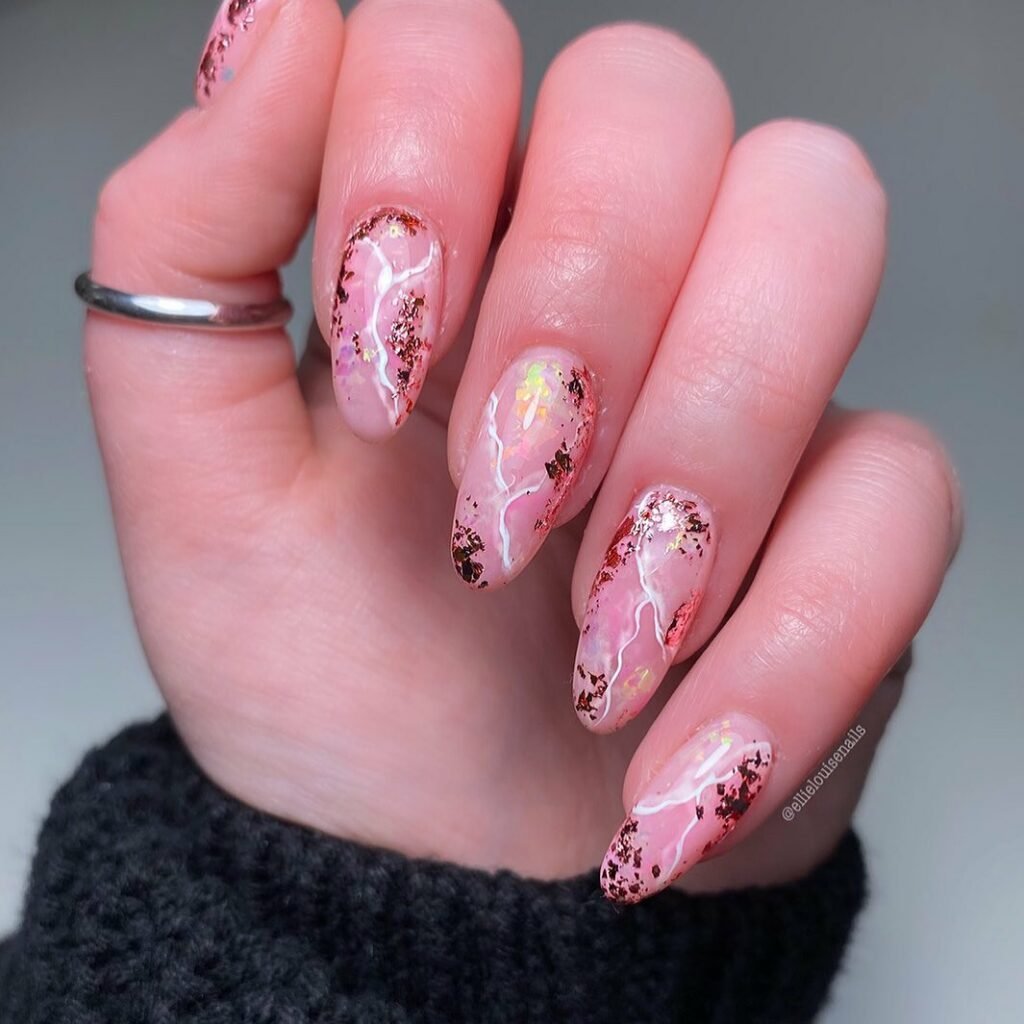 This design plays with texture beautifully — delicate pink marble paired with metallic flecks and those soft white veins drifting across each nail. It feels like rose quartz cracked open under sunlight, revealing tiny flashes of gold and iridescence.