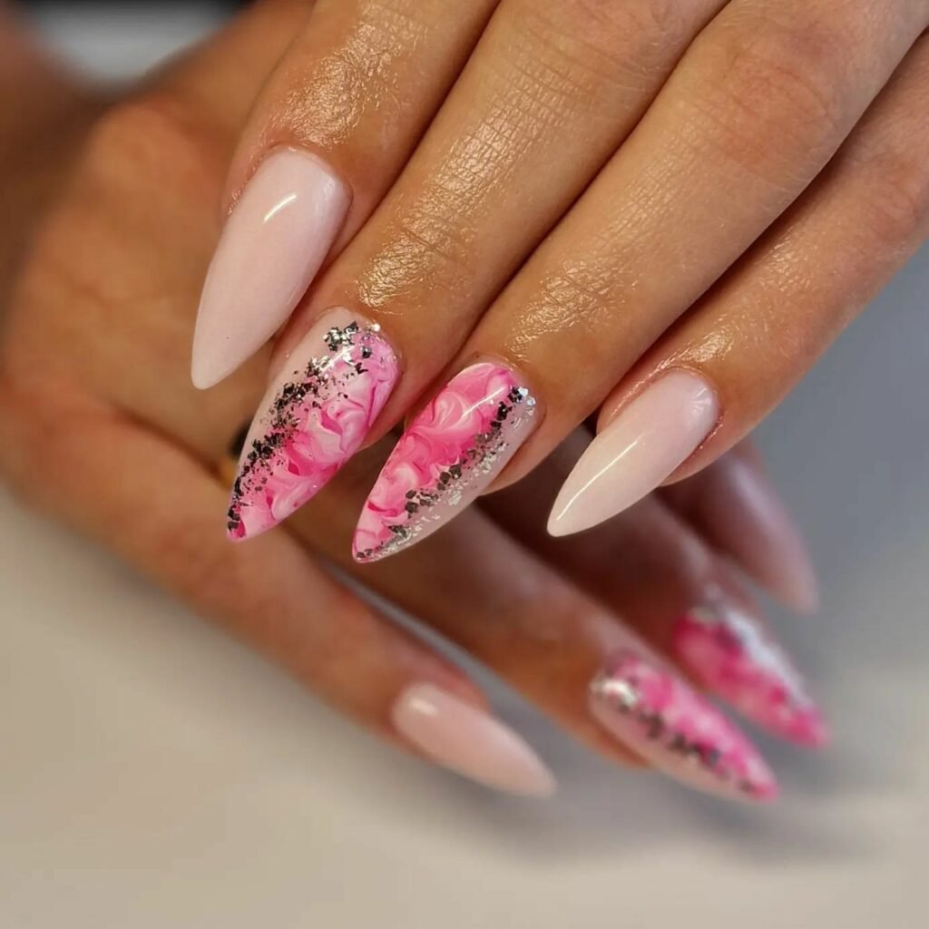 This set blends baby-pink elegance with marble drama in the smoothest way possible. The silver glitter cascading through the pink swirls looks like someone sprinkled fairy dust right before the top coat cured. It’s delicate, but still knows how to make an entrance.