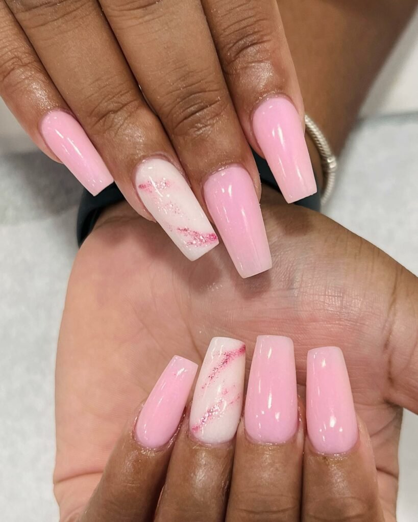 @nailsbycady_ delivers a fun high-contrast combo: creamy pink marbles paired with that loud, unapologetic hot-pink accent. It’s giving “Barbie but make it artsy,” and honestly, who’s complaining?