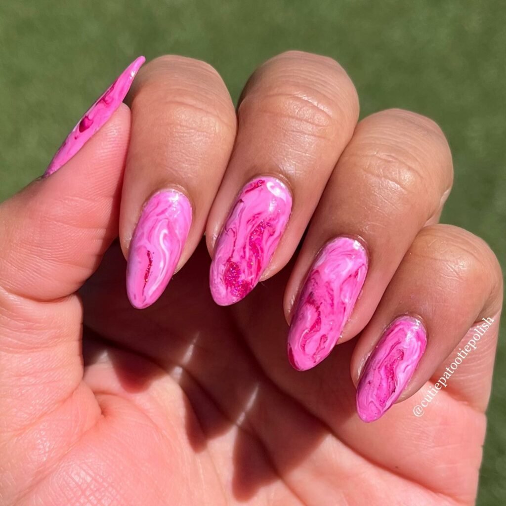 Bright, joyful pink marble takes center stage here — vivid, glossy, and full of summery energy. Each swirl looks hand-painted by sunlight, giving the nails this warm, glowing finish.