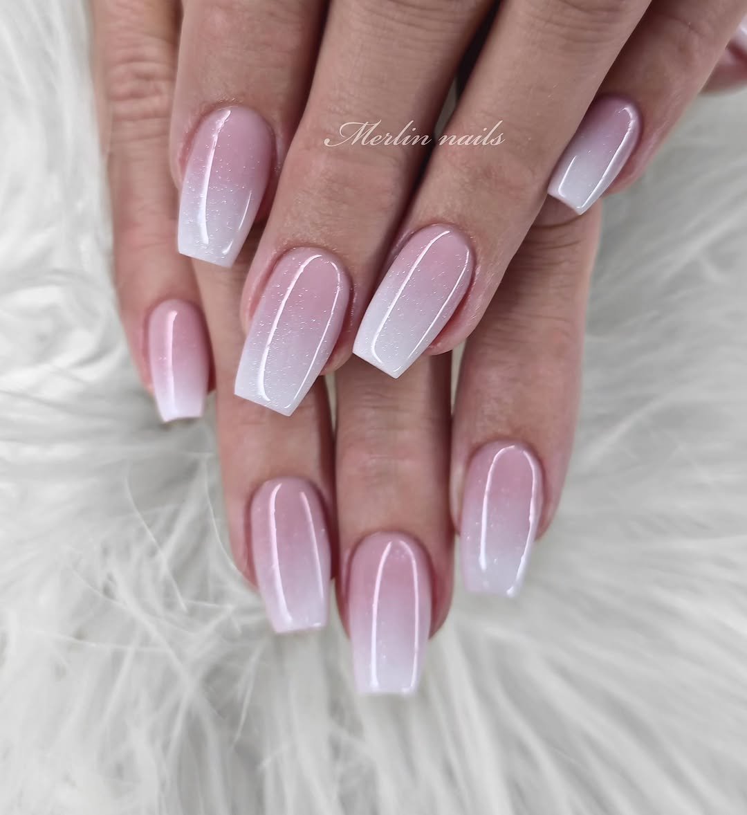 Here, the ombré gets a glow-up with subtle shimmer layered into the pink fade. The sparkle is gentle, catching light without overpowering the design.