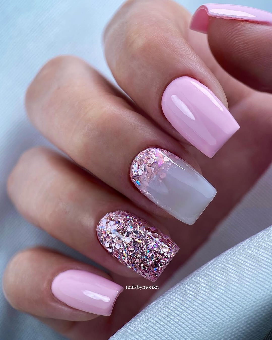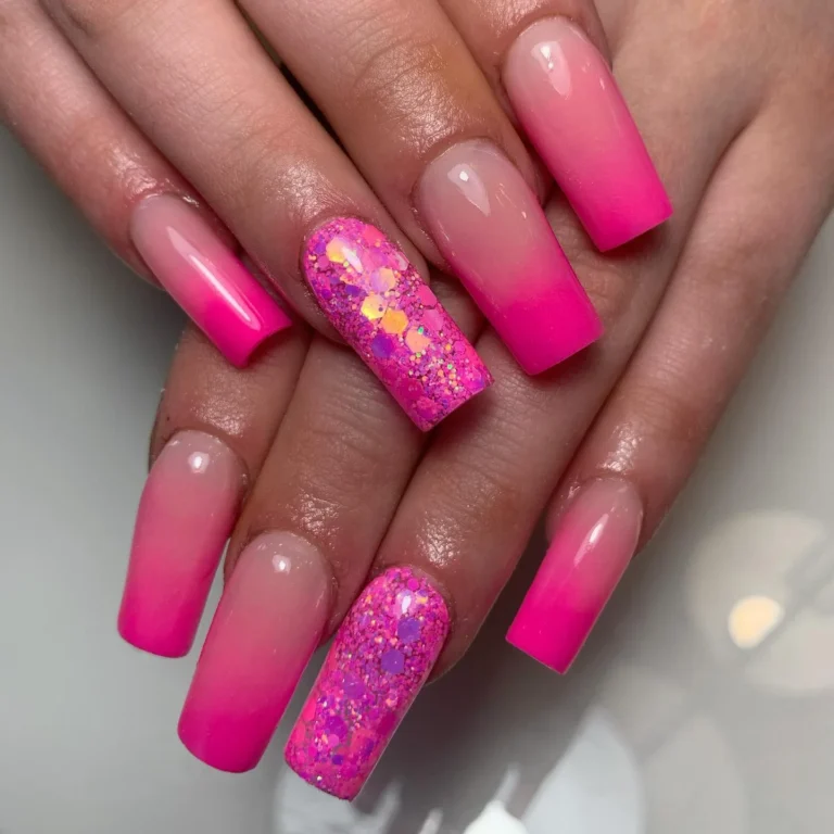 Ending strong with a pink ombré that leans into sparkle. The gradient stays clean while glitter accents elevate the entire look.