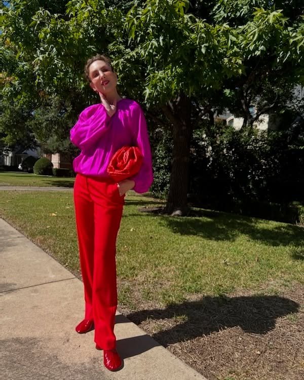 No one plays with bold color quite like Carla. This hot-pink blouse paired with power-red trousers is such a confident Valentine’s combination—electric, unapologetic, and so chic. The oversized clutch in matching red ties the whole moment together like a stylish exclamation mark.