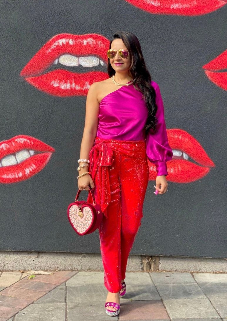 This look is Valentine energy turned all the way up — the hot-pink satin top paired with those fiery red embellished trousers is such a power combo. It feels fearless and glamorous, like she’s walking straight into a romantic movie scene with lips on the wall cheering her on.