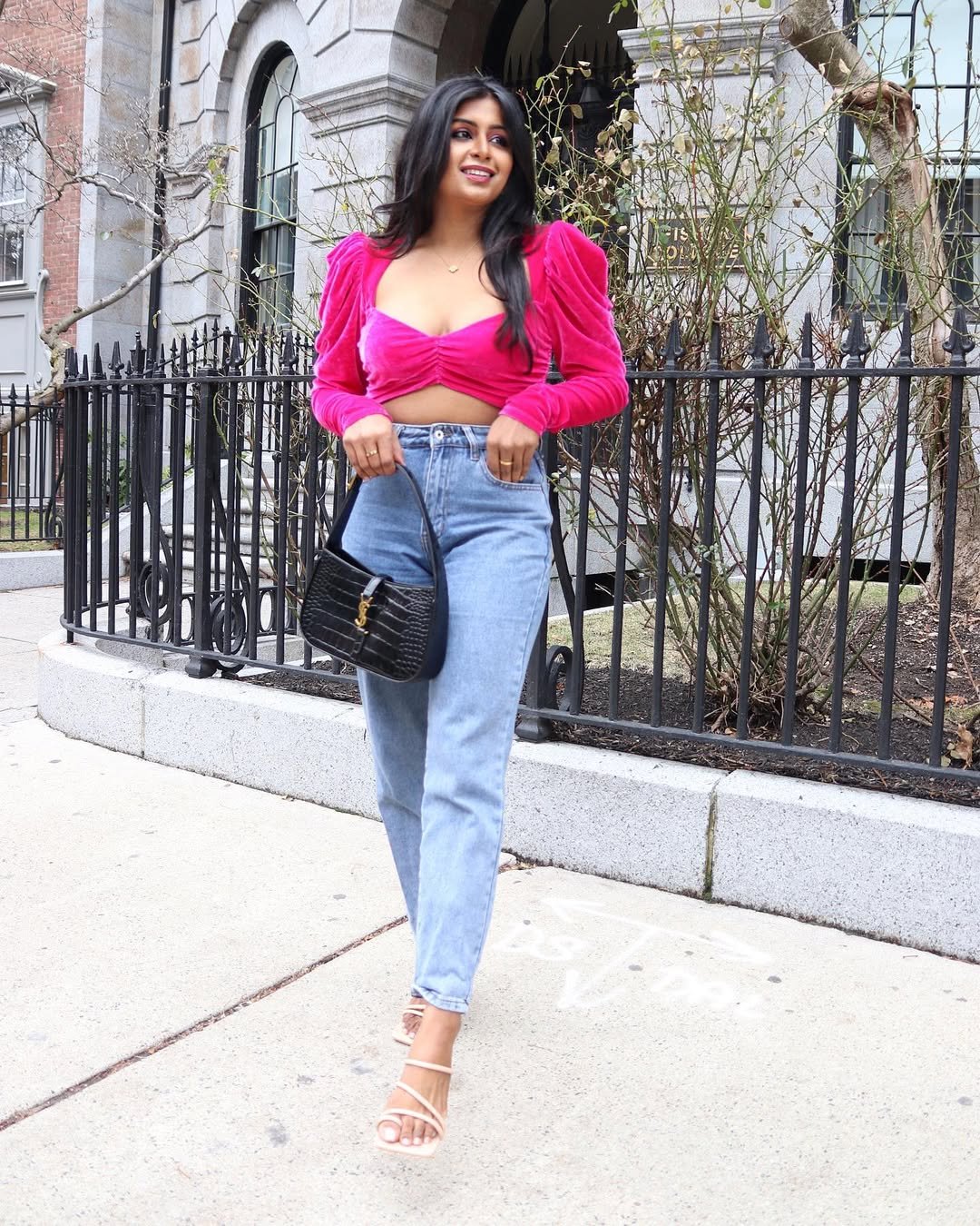 A bold pink velvet crop top with ruched sleeves brings instant Valentine charm, especially when balanced with laid-back denim. It’s that perfect mix of flirty and easygoing — the kind of look you wear when you want to feel cute without trying too hard.
