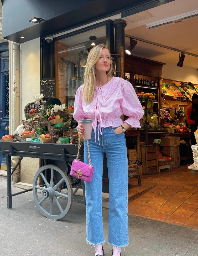 A breezy pink peasant-style top paired with classic denim makes for the sweetest everyday Valentine look. The soft stripes and puff sleeves add just a hint of romance without feeling costume-y. And the quilted pink bag? A perfect finishing touch.