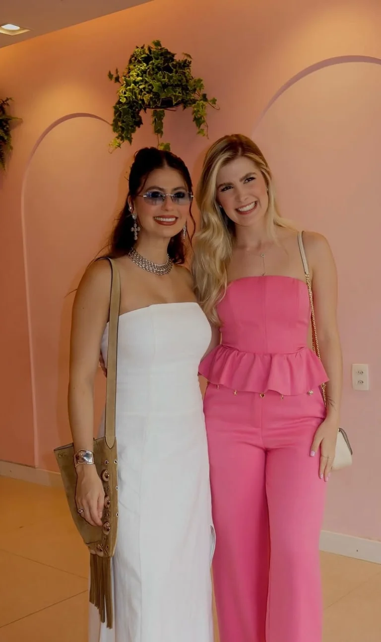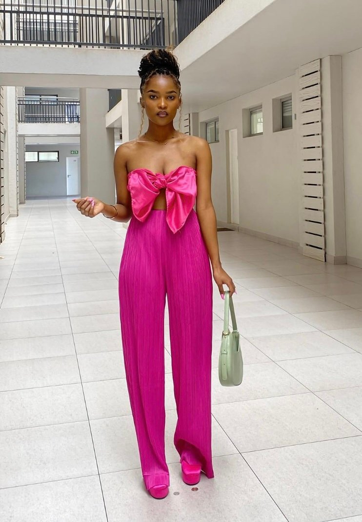 Hot-pink peplum paired with tailored trousers instantly brings that flirty-fancy energy. Standing next to a friend in a sleek white dress, the contrast makes the pink feel even more vibrant.