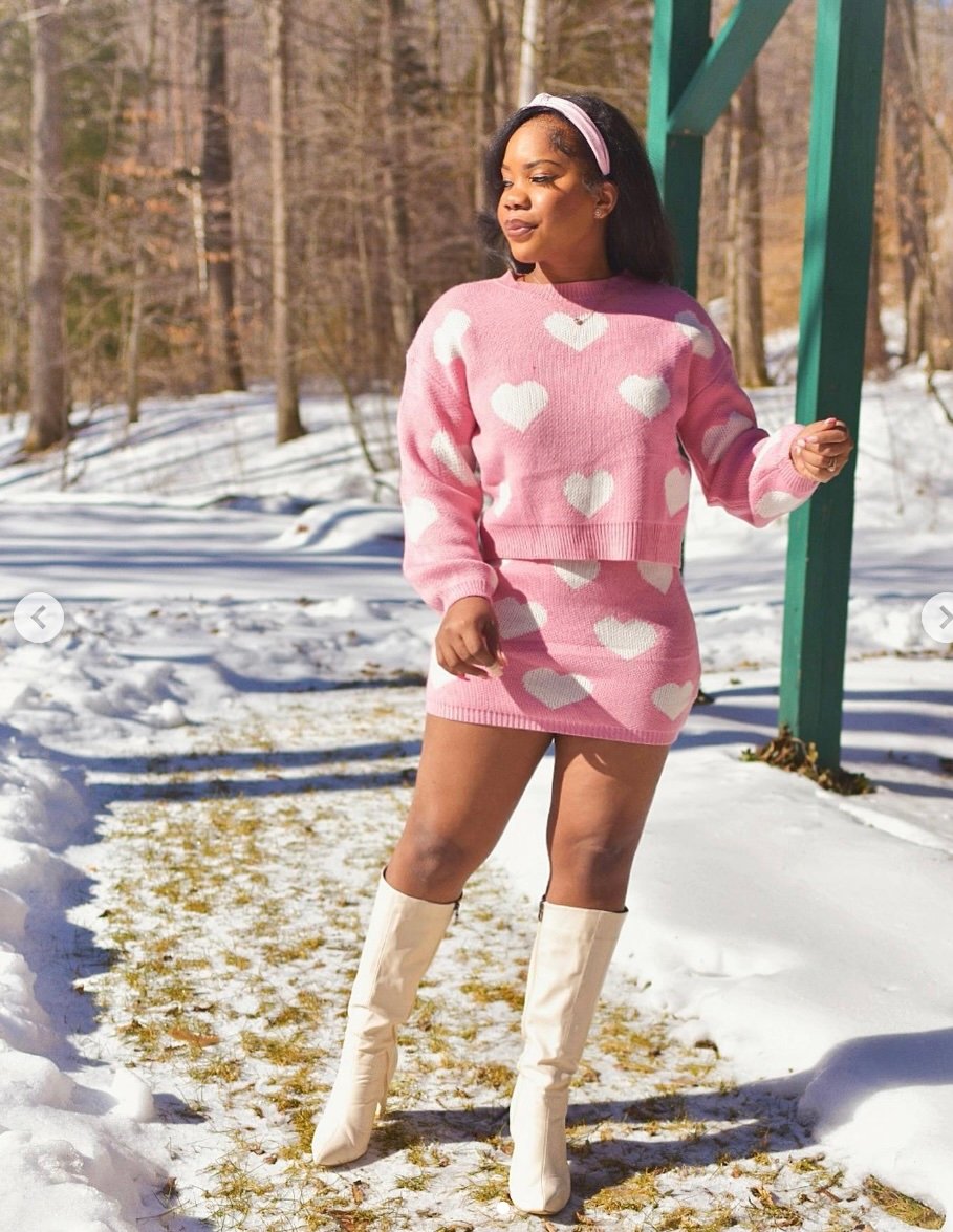 A matching knit set covered in hearts? Truly peak Valentine’s energy. The soft blush tones paired with cozy textures make this look feel festive without crossing into costume territory.