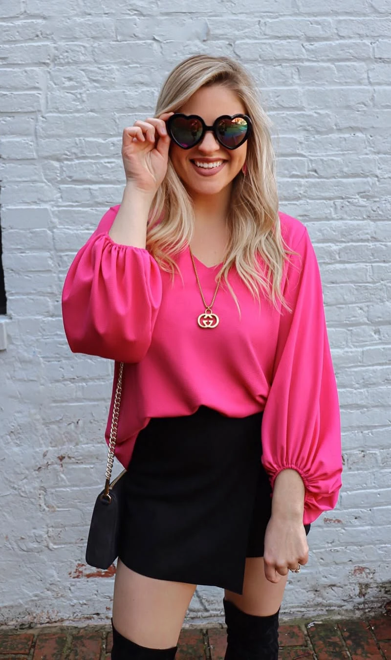 The pop of hot-pink paired with a chic black mini brings such a fun, flirty vibe. The balloon sleeves give the top this soft, romantic drama while the heart-shaped sunglasses add a wink of Valentine mischief.