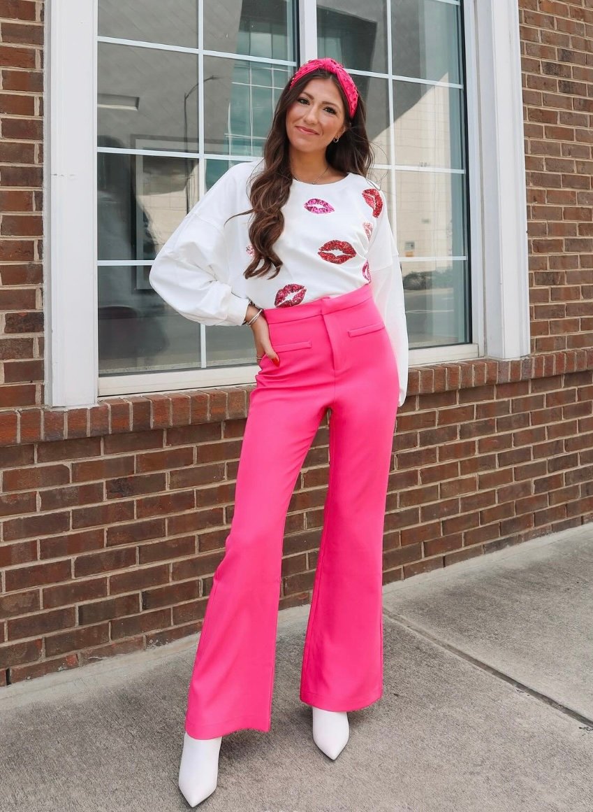 If Valentine’s Day had a dress code, this sweatshirt would be it—bold lip prints, a pop of bright pink, and trousers that mean business (in a very cute way). The flared silhouette and crisp white boots make the look feel unexpectedly sharp.