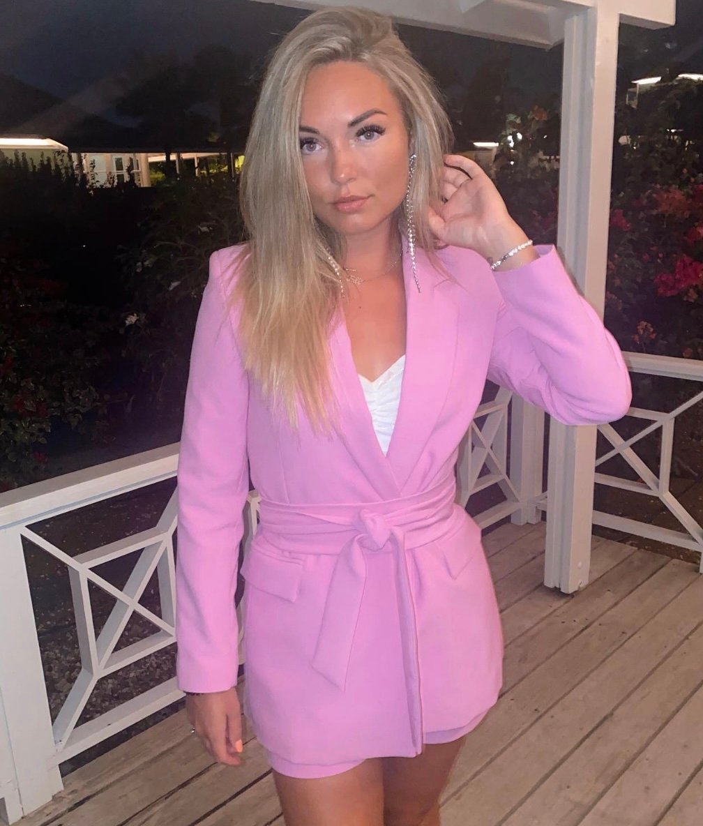 This rosy blazer-dress is the perfect blend of tailored and romantic. The wrap belt cinches everything in with that subtle “perfectly put together” finish, and the statement earrings give it just the right amount of sparkle for an evening out.