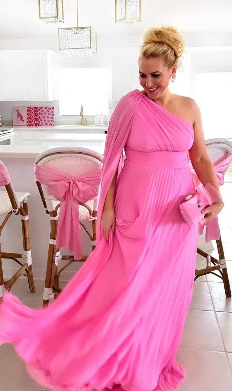 There’s something so dreamy about this soft, sweeping one-shoulder gown—the kind that moves with you and makes the whole room feel a little more romantic. The cape-like drape, the pleated skirt, the bubblegum hue… it all comes together in a look that feels tailor-made for a Valentine’s dinner you actually dress up for.