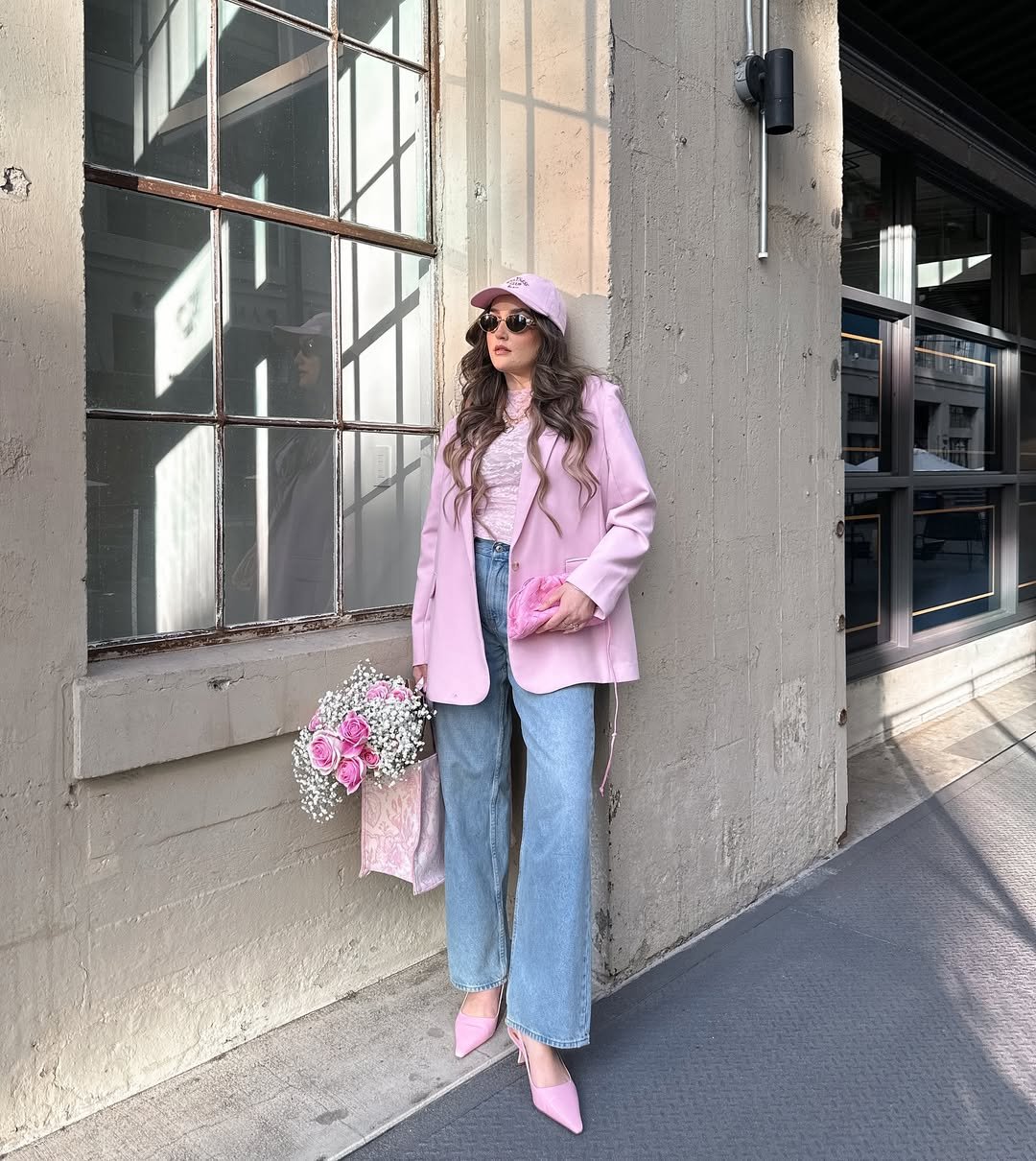 A pink blazer always hits, but paired with relaxed denim and a simple white top? It becomes that effortlessly stylish combo you reach for again and again. The nude heels keep things sleek without overpowering the look.