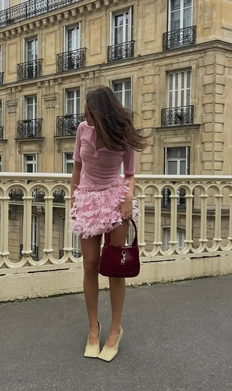 Light pink paired with crisp white always feels so fresh, especially when it’s styled with a flirty ruffled mini skirt. This outfit has that modern-girly aesthetic—clean, polished, but still fun enough for a Valentine’s brunch or daytime date.