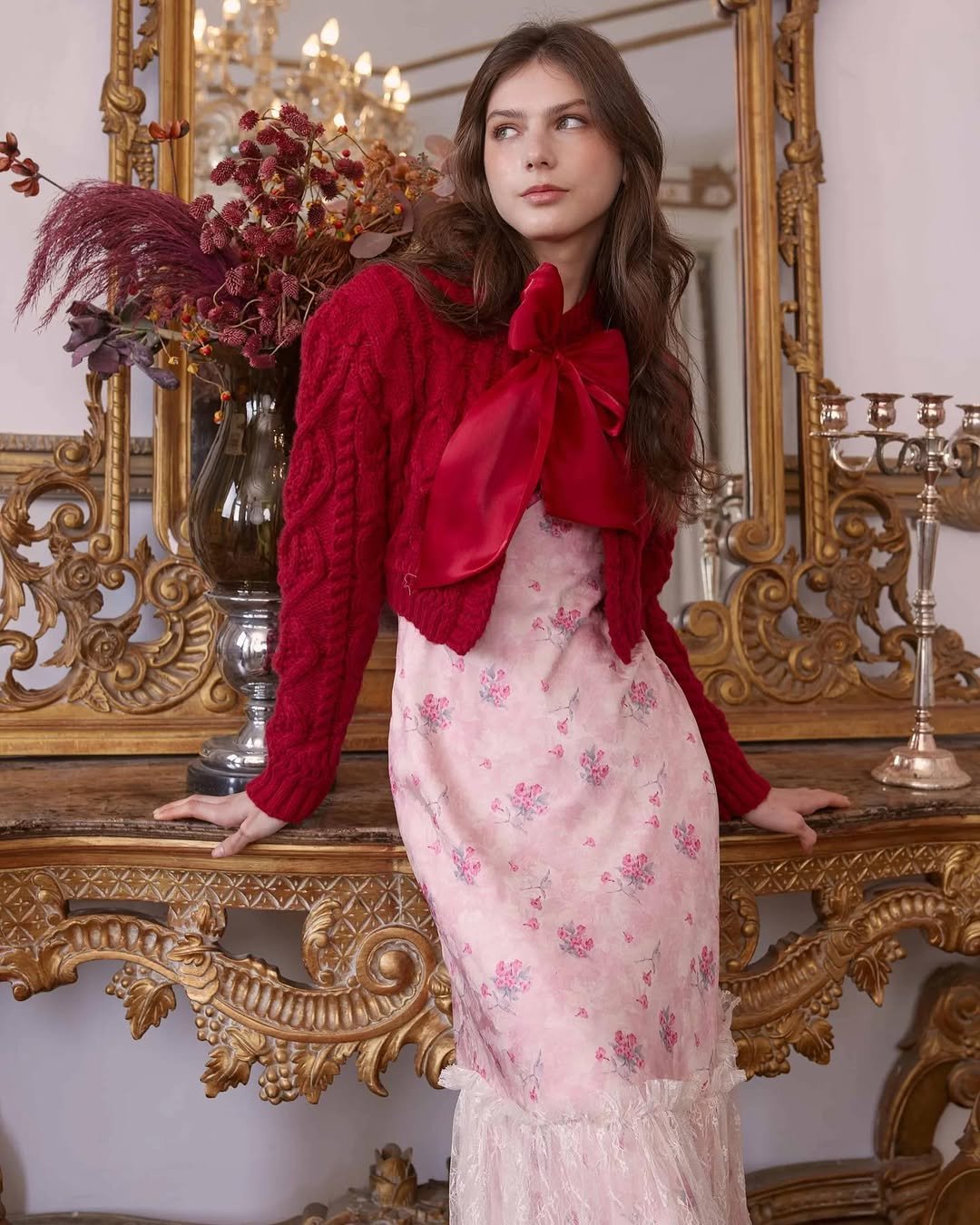 This look feels like stepping into a romantic period film—the plush red cardigan, the oversized satin bow, and that soft floral slip dress coming together in the dreamiest, old-world Valentine palette. It’s feminine in that effortless, poetic way that doesn’t try too hard yet still steals every glance in the room.