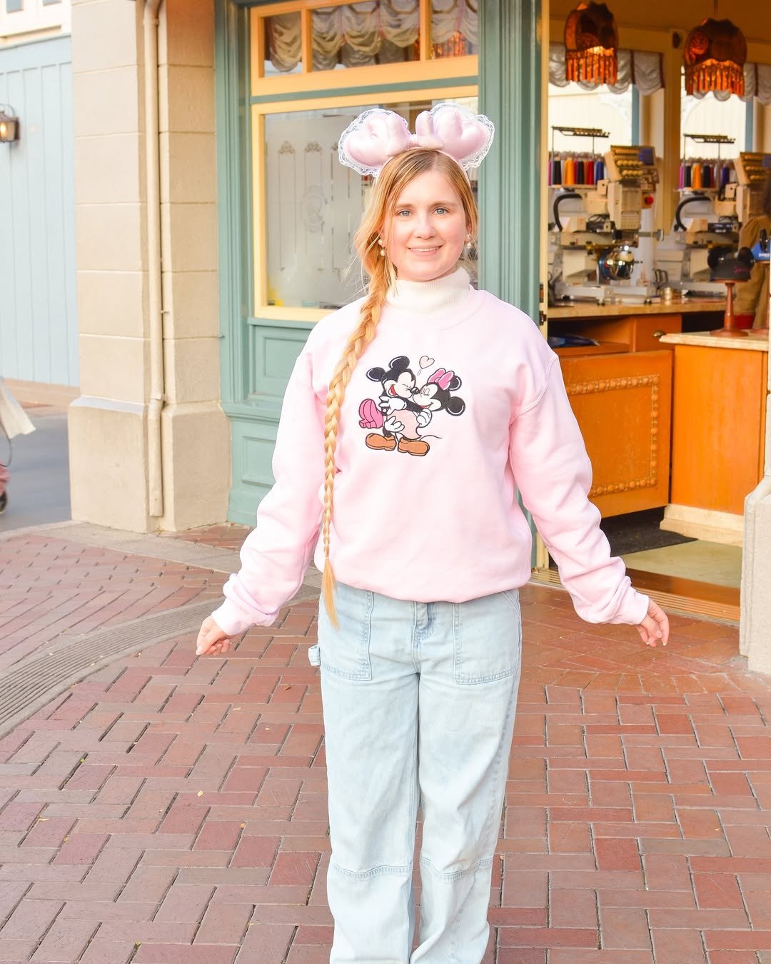 Nothing says “cute Valentine fun” quite like a pastel Minnie Mouse sweater and soft denim. This look has that charming, theme-park sweetness — light, cozy, and nostalgic in the best way.