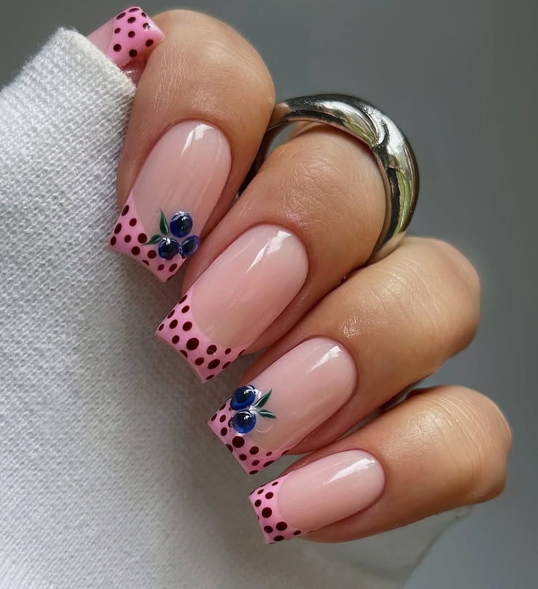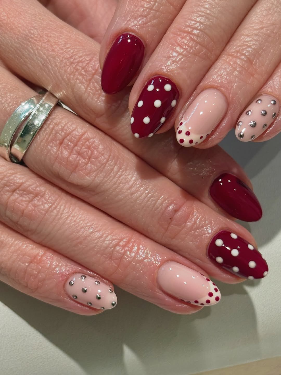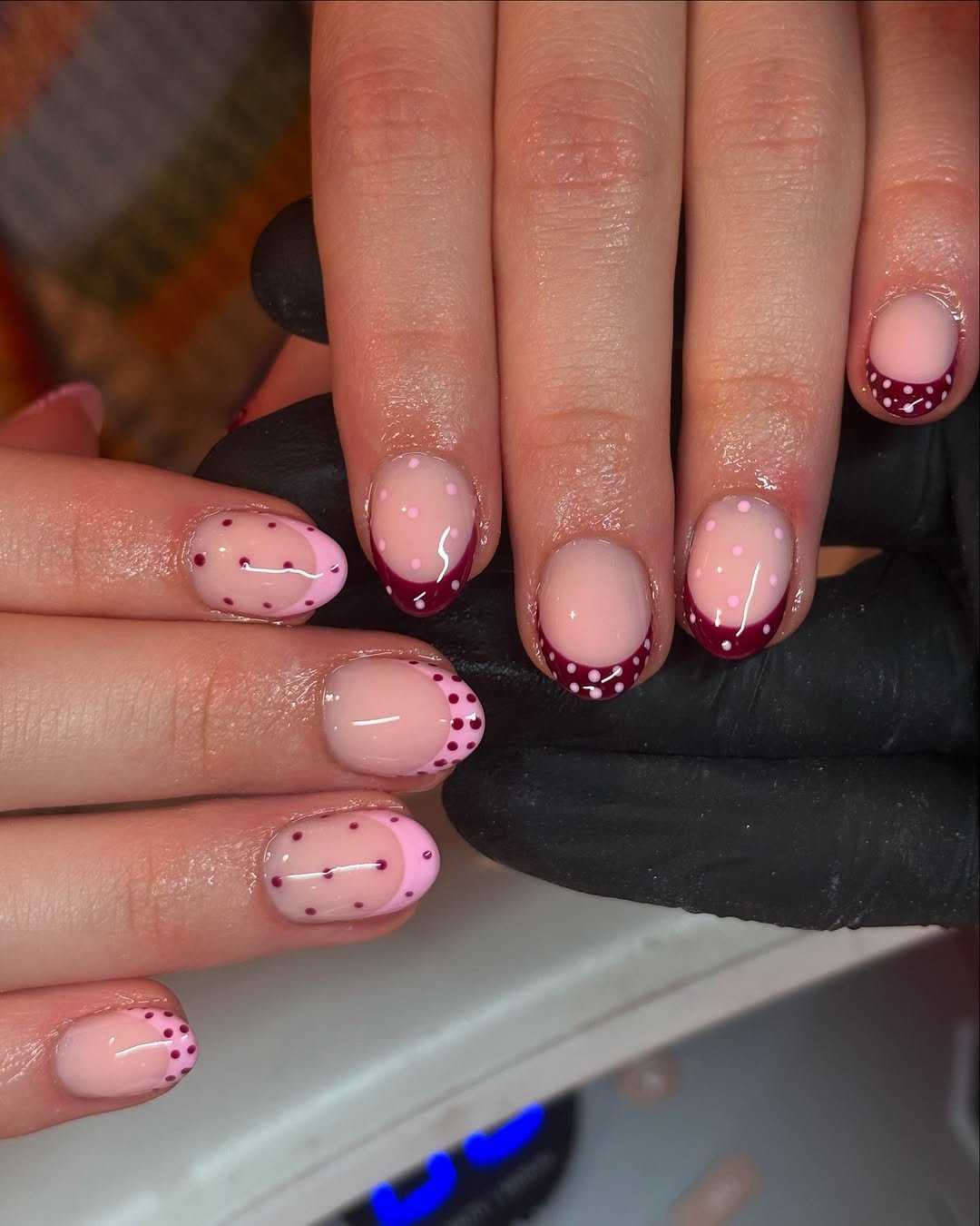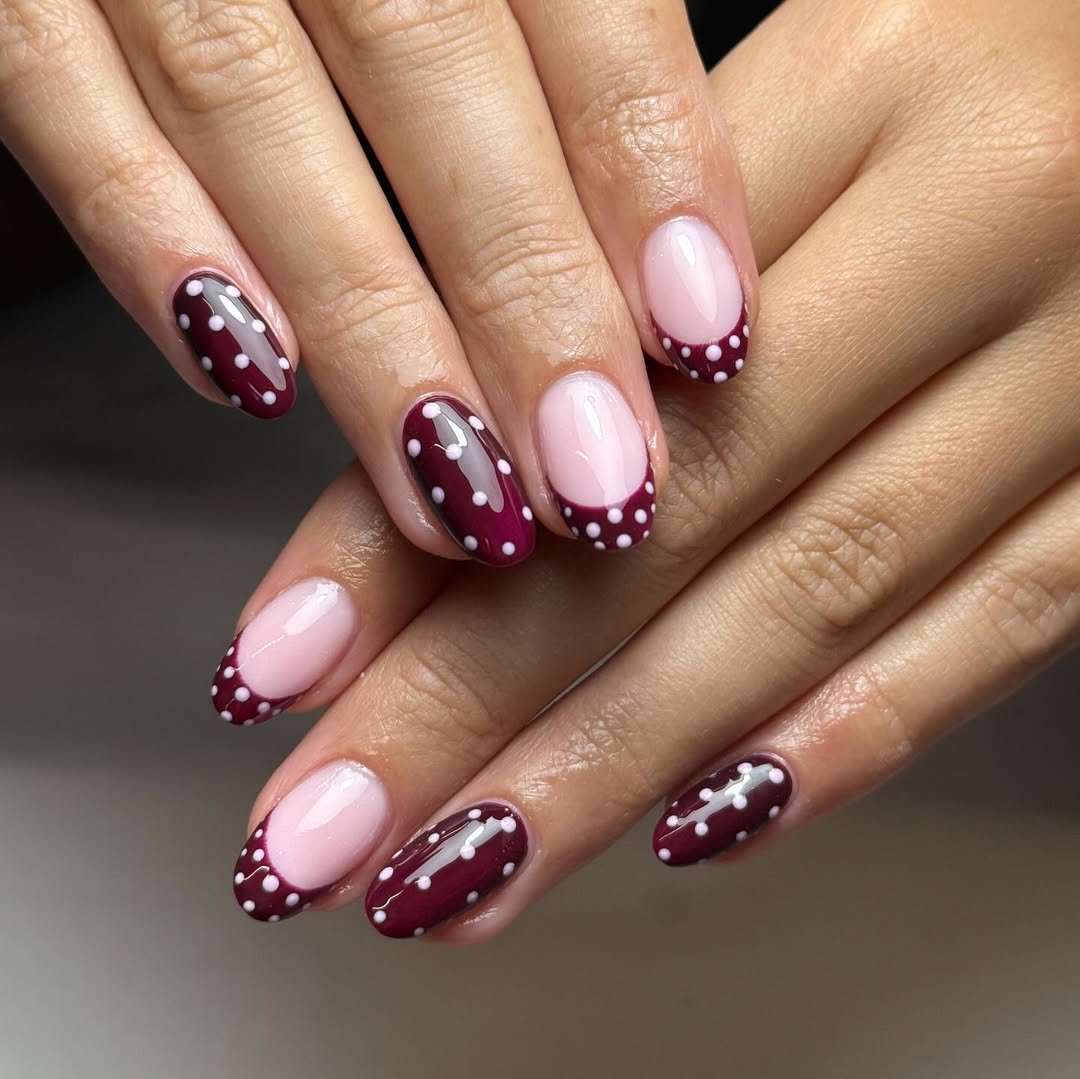 That glossy berry French paired with delicate dot accents? Chef’s kiss. The soft pink base keeps it wearable, while the darker tips bring the drama.