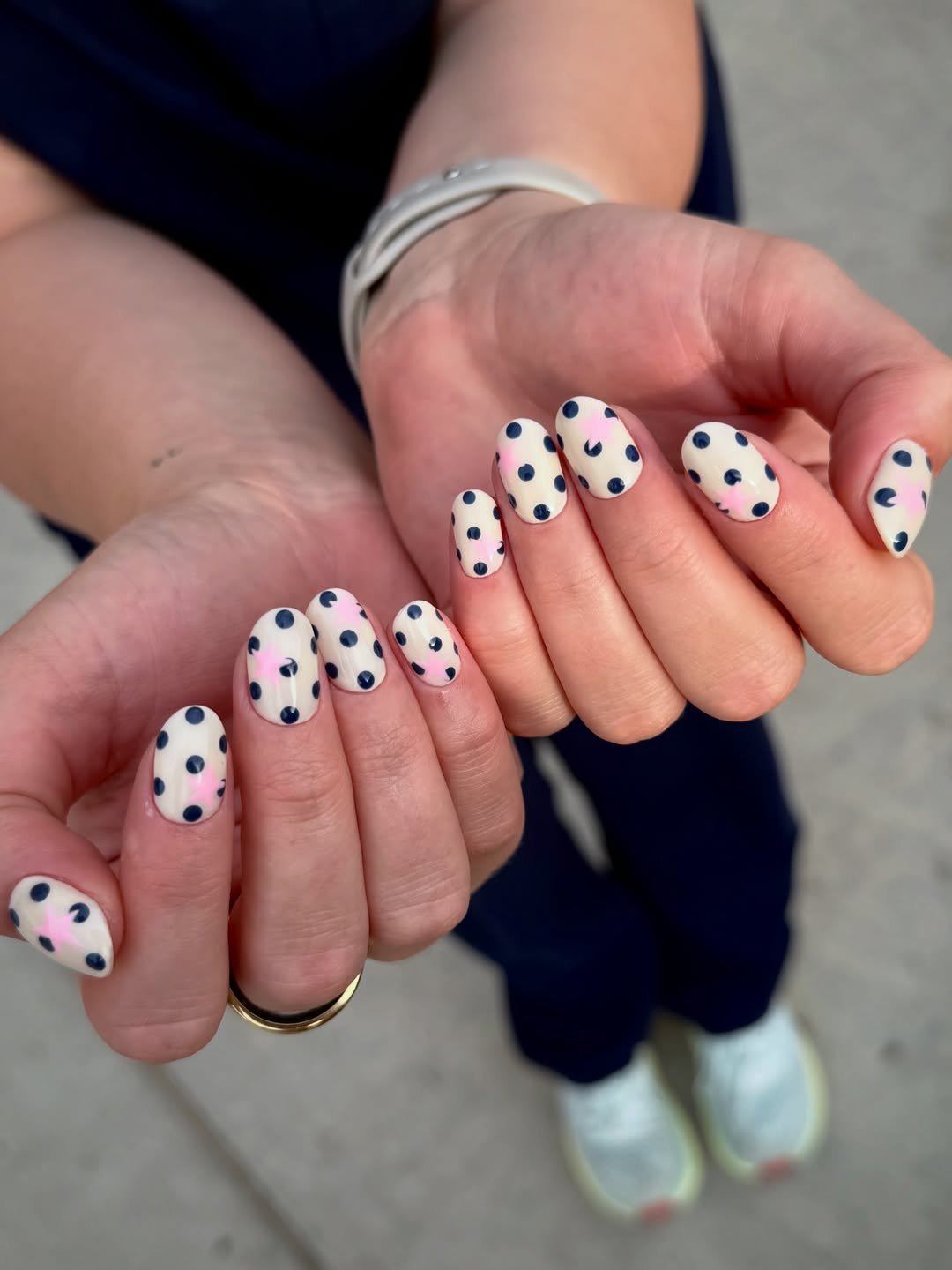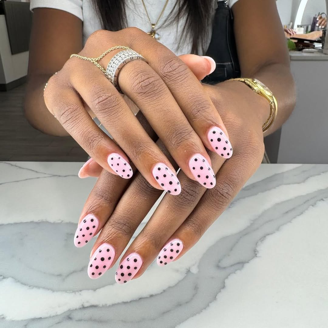 Soft pink bases with classic black dots — timeless, cute, and totally Instagram-ready. This is polka dots in their purest form, done clean and confident.