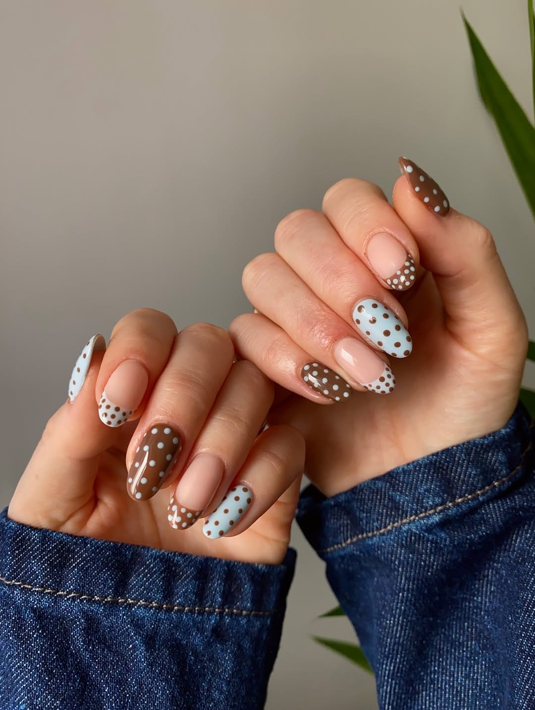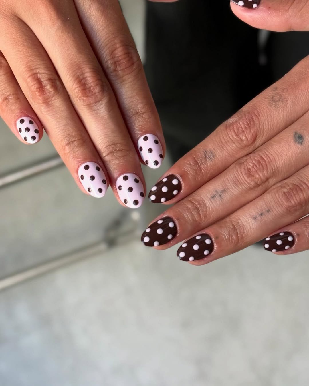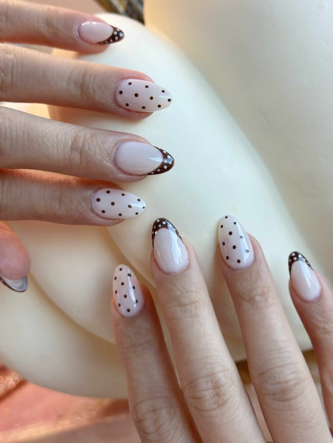 Okay but this combo? Unexpected in the best way. Creamy nudes meet chocolate tips and pastel dots, and suddenly polka dots feel fresh again.
