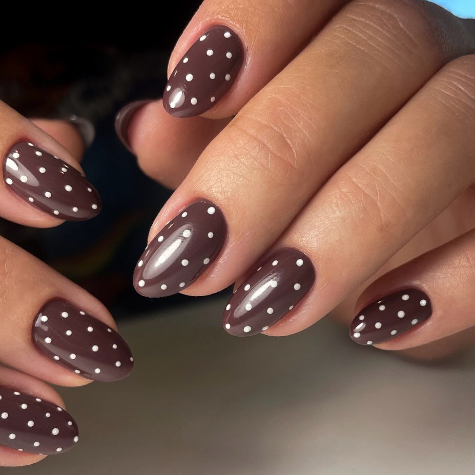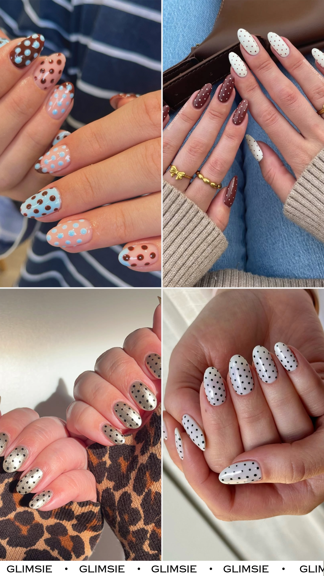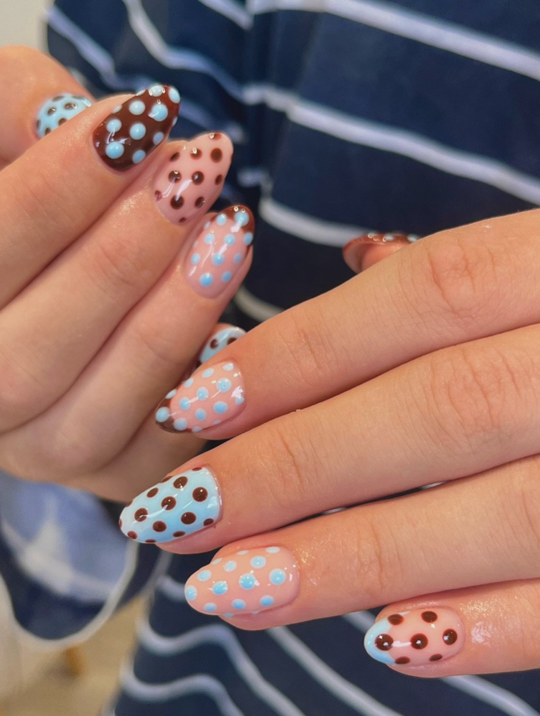 Okay but this combo? Unexpected in the best way. Creamy nudes meet chocolate tips and pastel dots, and suddenly polka dots feel fresh again.