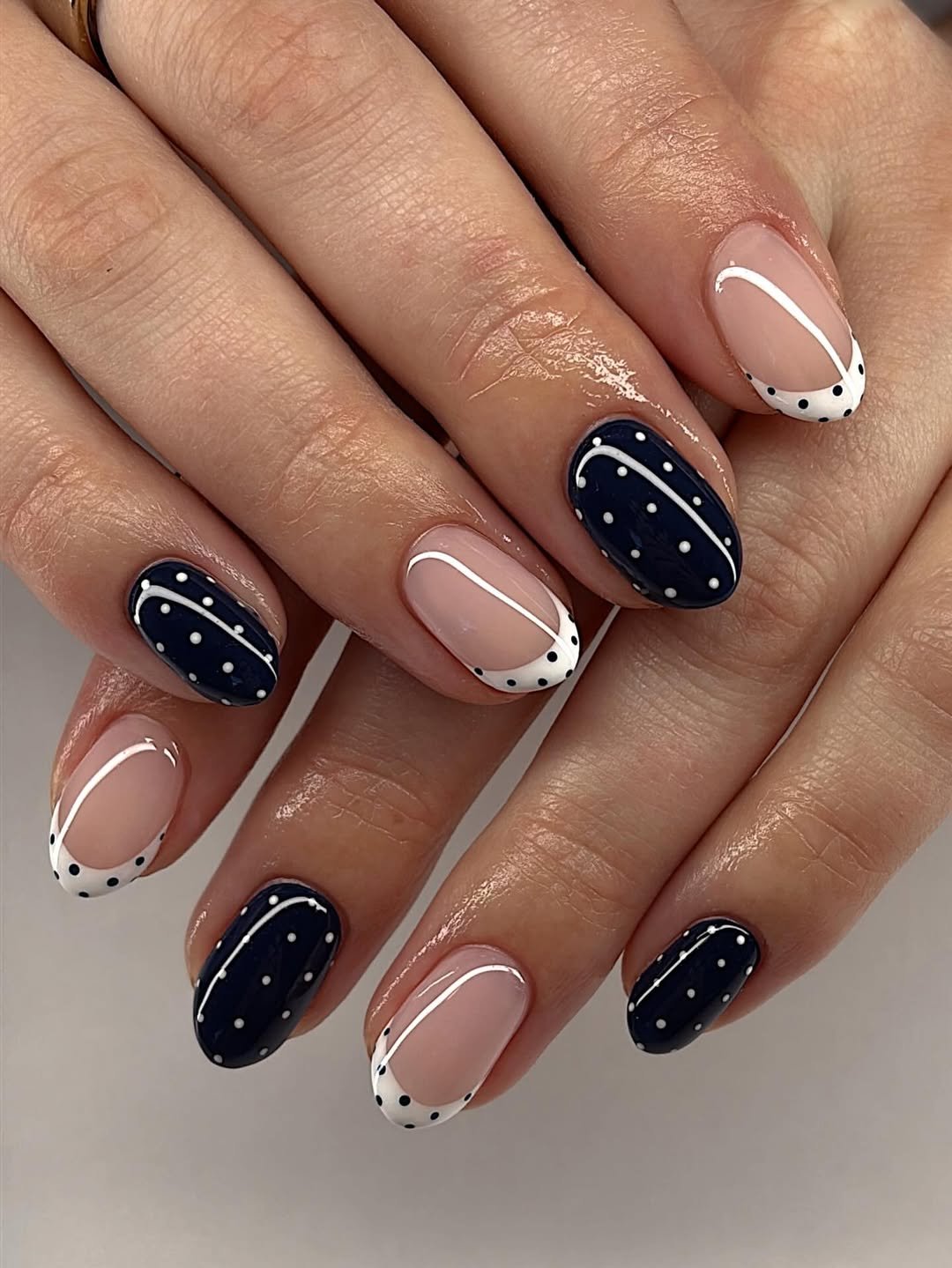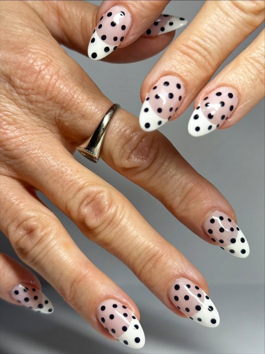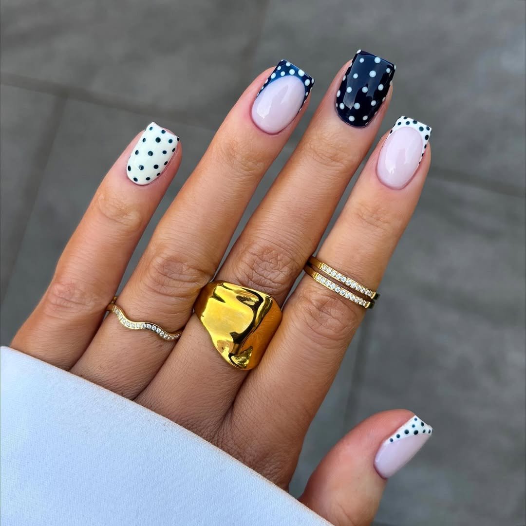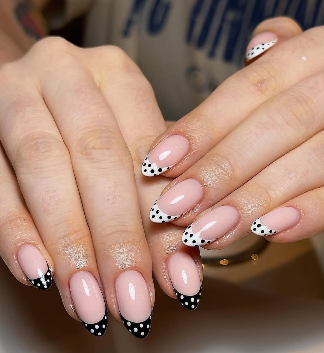 This one leans timeless. Nude bases, crisp black tips, and neat dots create that chic Parisian energy we’ll never get tired of.