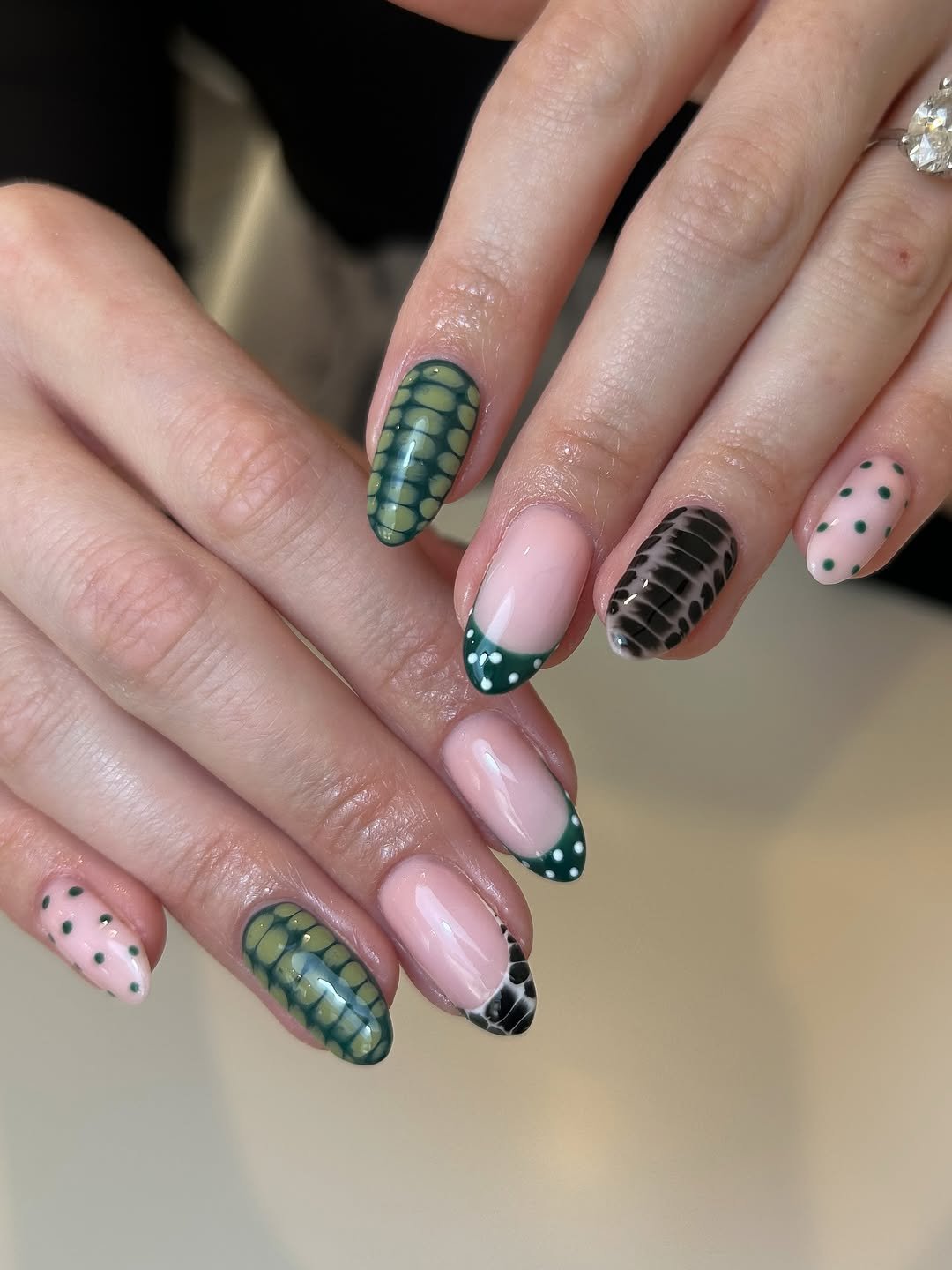 This one leans bold in the best way — deep greens, soft blush bases, and textured dot details that almost feel reptile-inspired (but elevated).