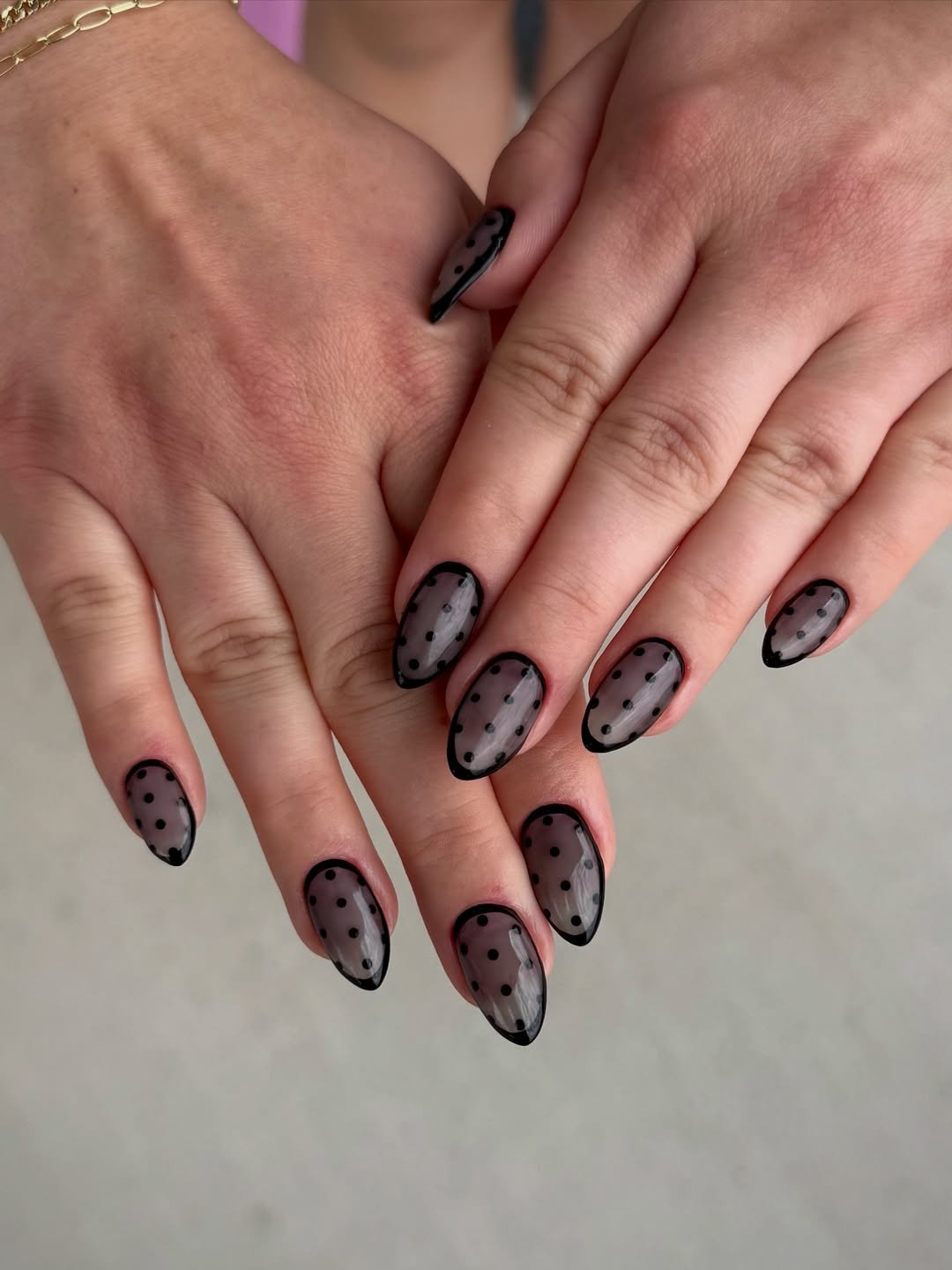 Okay, this set is pure attitude. Sheer bases framed with bold black edges and scattered dots? It’s edgy, modern, and low-key iconic.