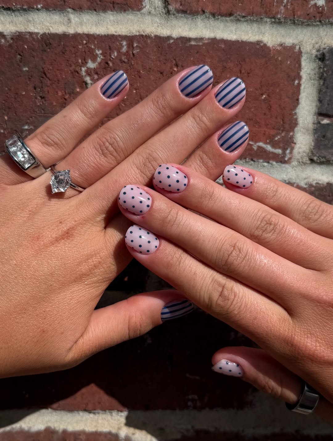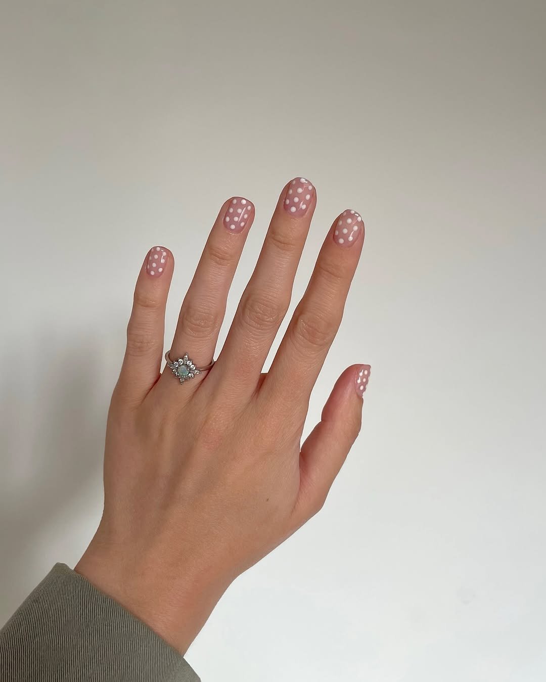 Muted pink bases with clean white dots — this one is all about subtle charm. It’s minimal, airy, and super wearable for everyday life.