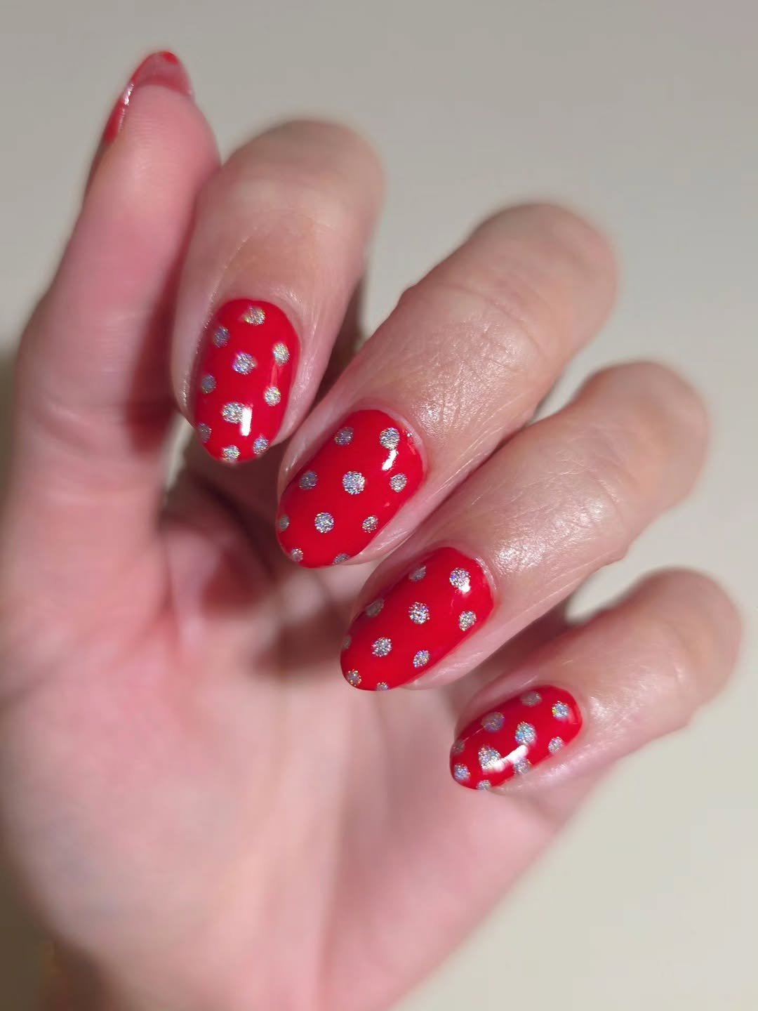 Bright red nails topped with shimmering silver dots bring instant party vibes. Bold, glossy, and unapologetically fun.