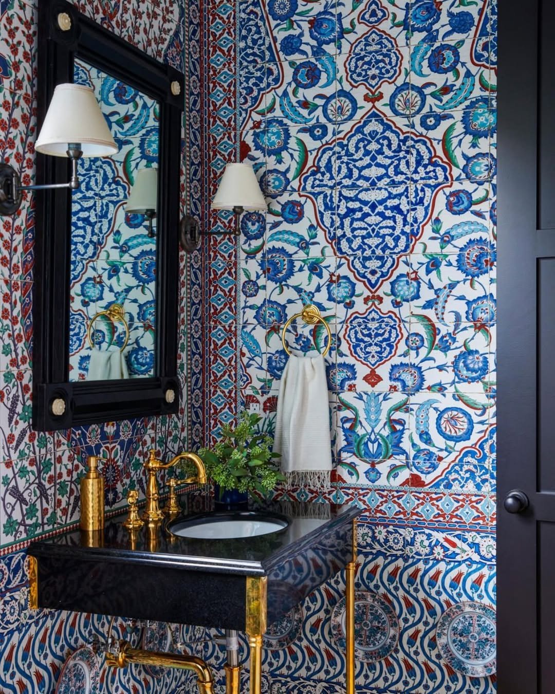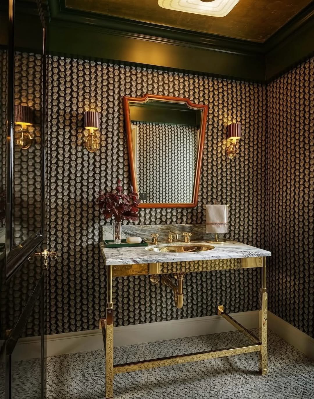 This one leans into full-on old-school glam. The patterned walls, gold console sink, and warm lighting give it that slightly retro, high-end feel.