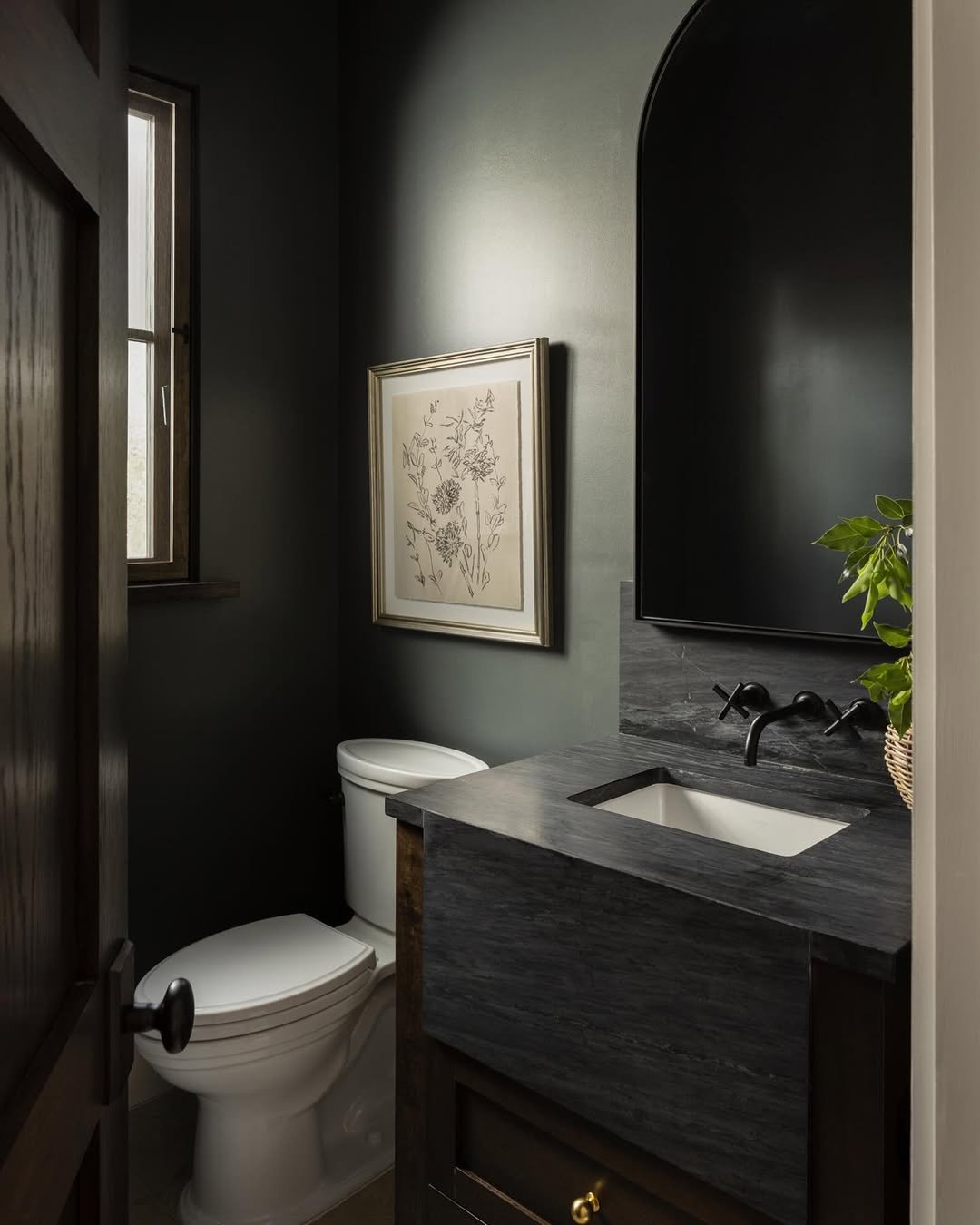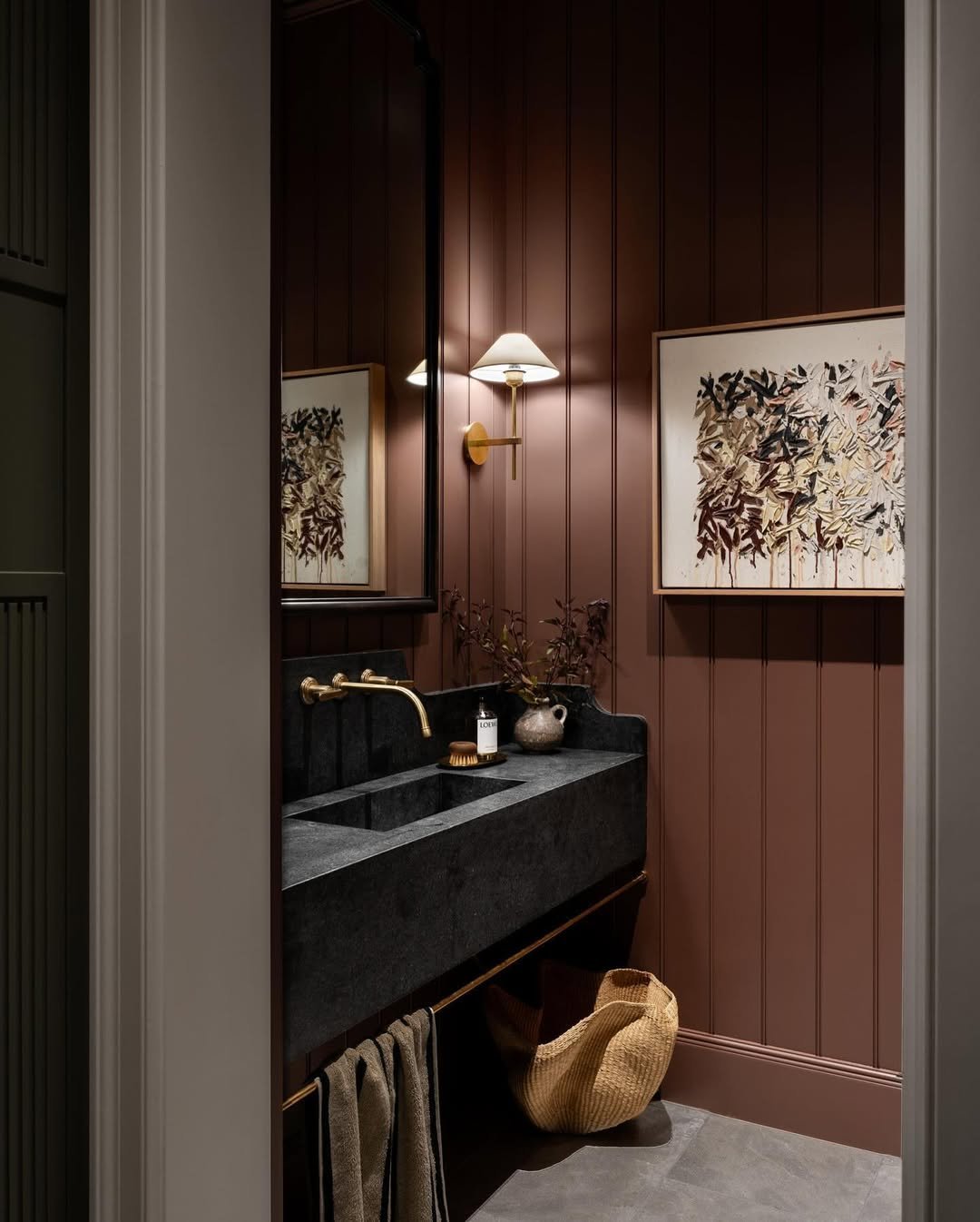 Dark tones done right. The rich wall color paired with that stone sink instantly makes this space feel elevated and grounded at the same time.