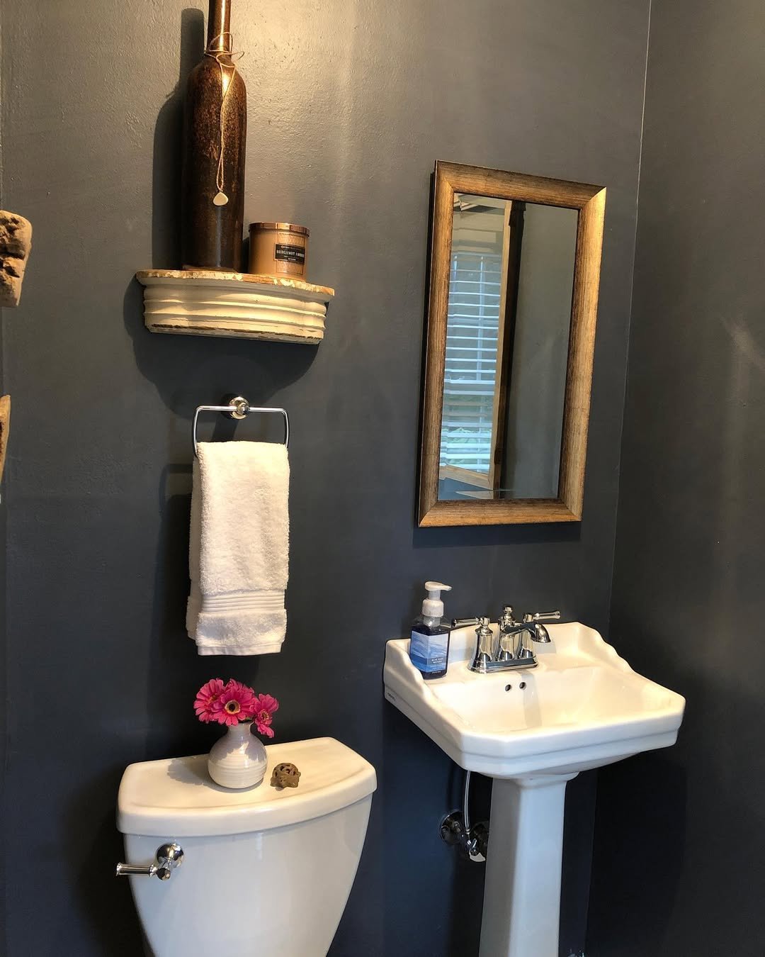 Proof that even the smallest corner can work hard. The dark walls, minimal decor, and classic pedestal sink keep everything feeling tight and intentional.