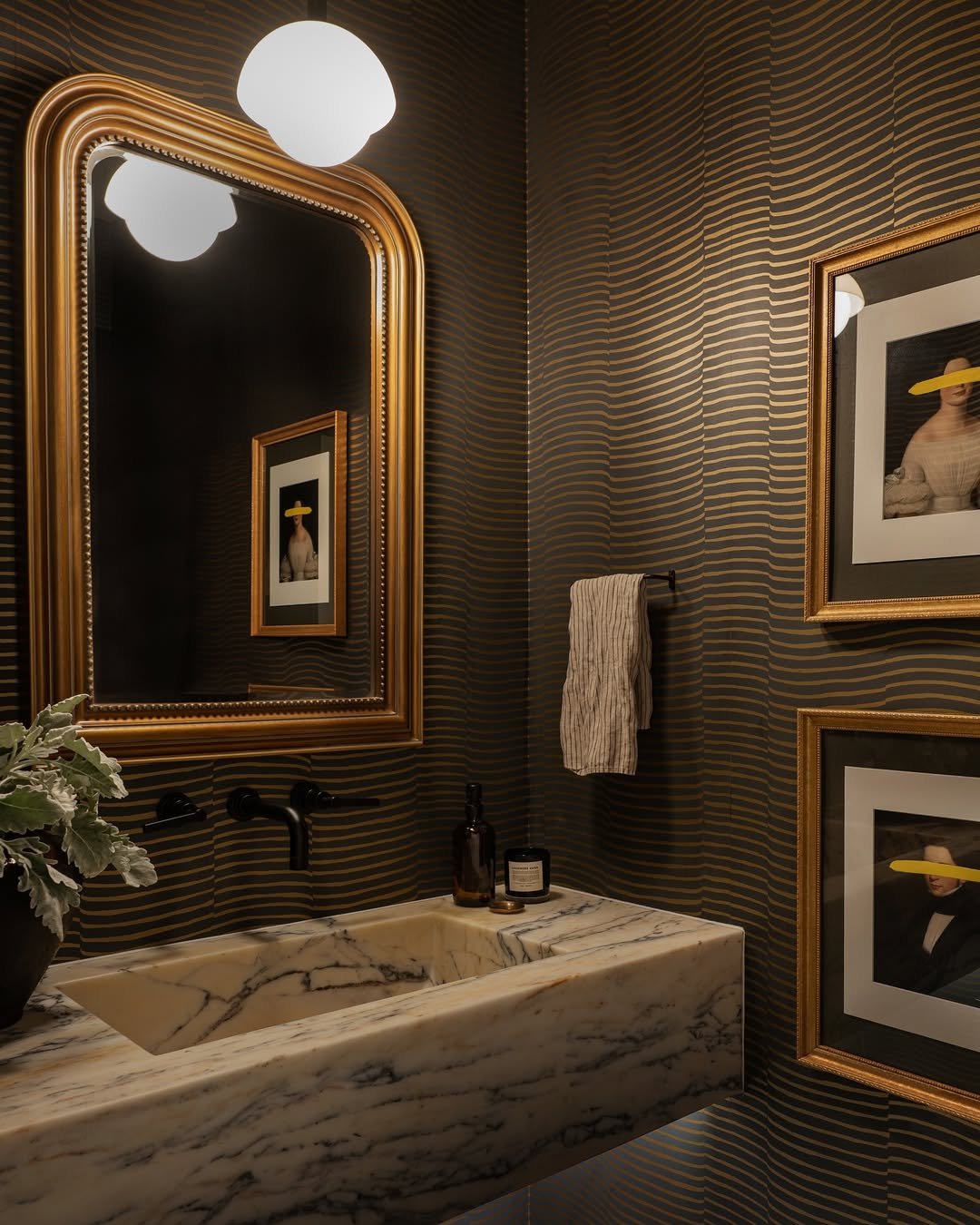 Dark, moody, and a little glam. That striped wallpaper paired with the sculpted mirror and marble sink creates a space that feels both modern and vintage at the same time.