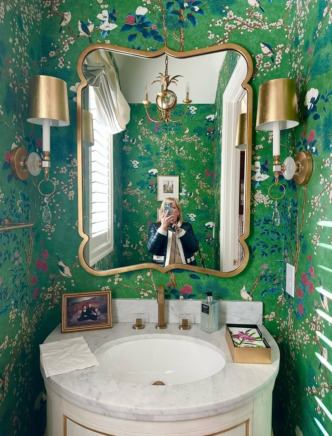 This one feels like a hidden gem. The vibrant green wallpaper wraps the room in personality, while the gold accents elevate it into something a little more polished.