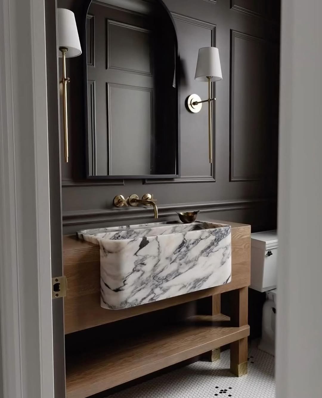 Dark walls, clean lines, and a marble sink that does all the talking. This space strips things back but still manages to feel rich and grounded.