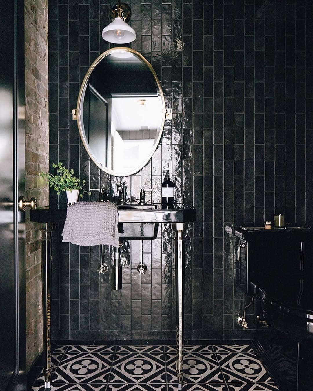 This one leans all the way into drama—and pulls it off beautifully. The glossy dark tile, paired with that sleek console sink, gives it a slightly industrial, slightly luxe vibe.
