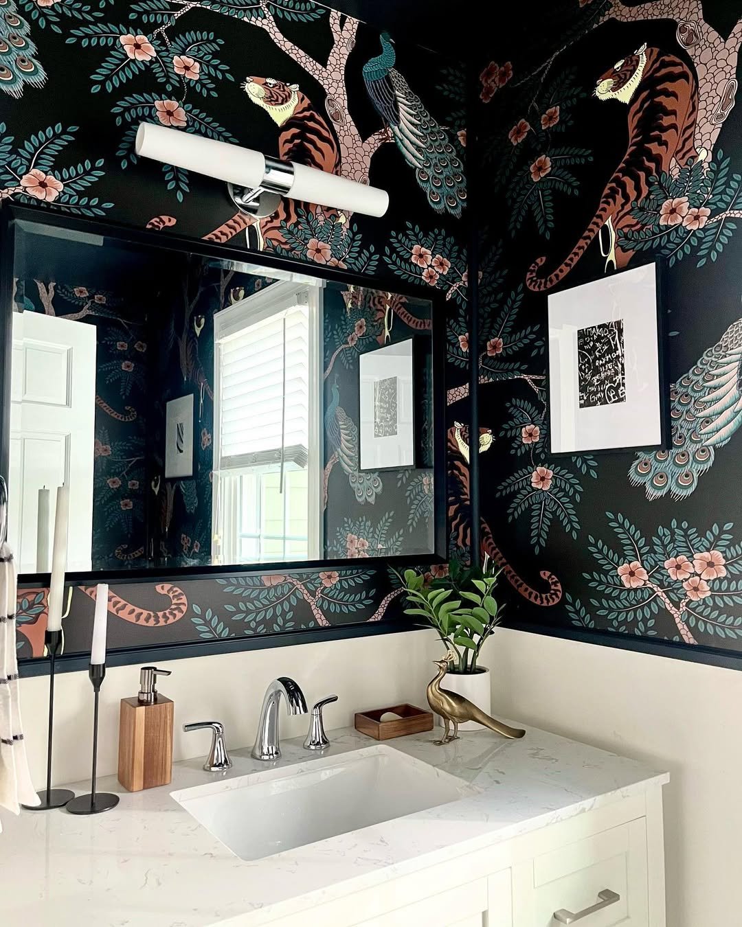 This is where things get fun again. The bold wallpaper with birds and tigers instantly turns the room into a conversation piece.