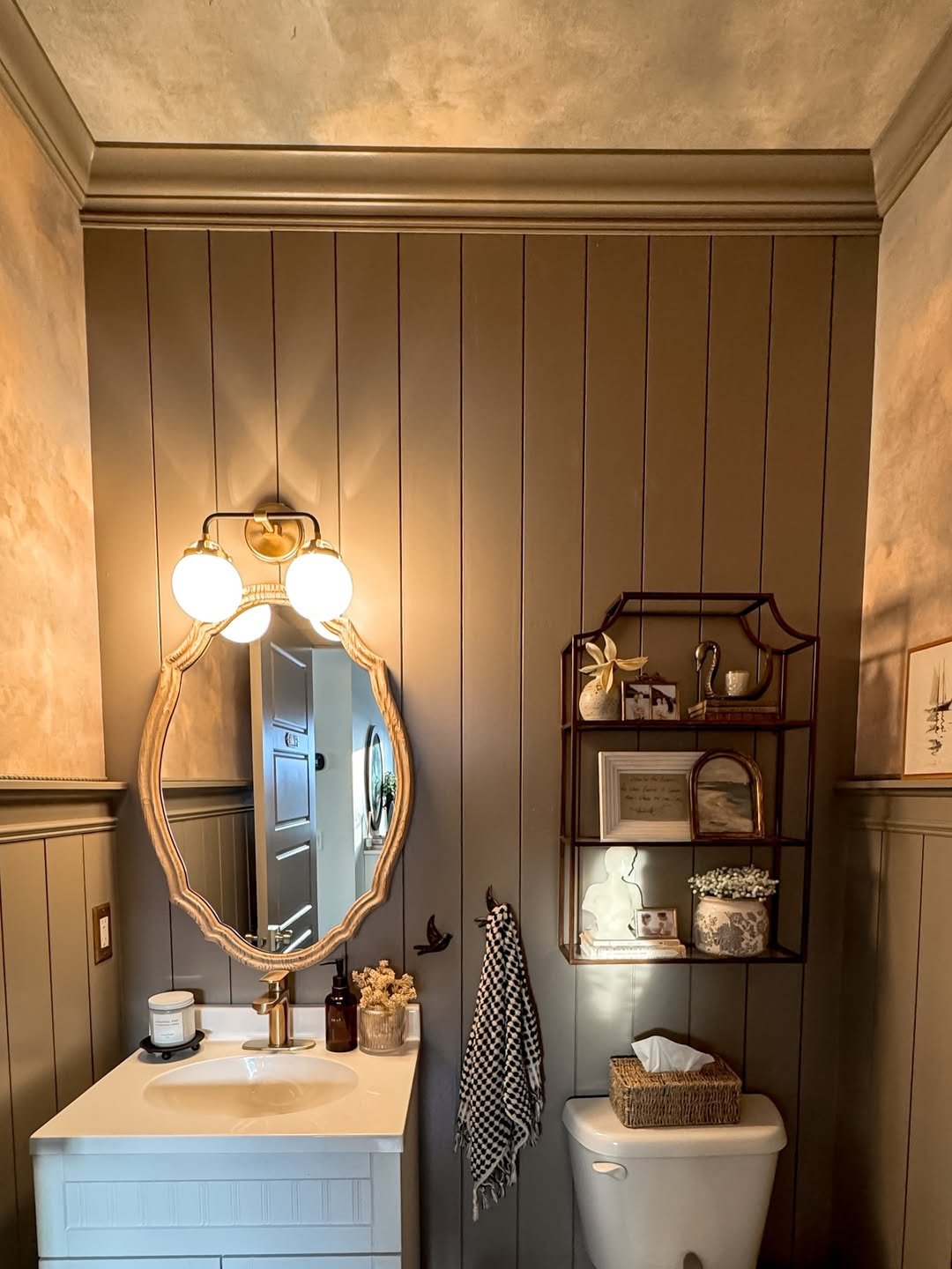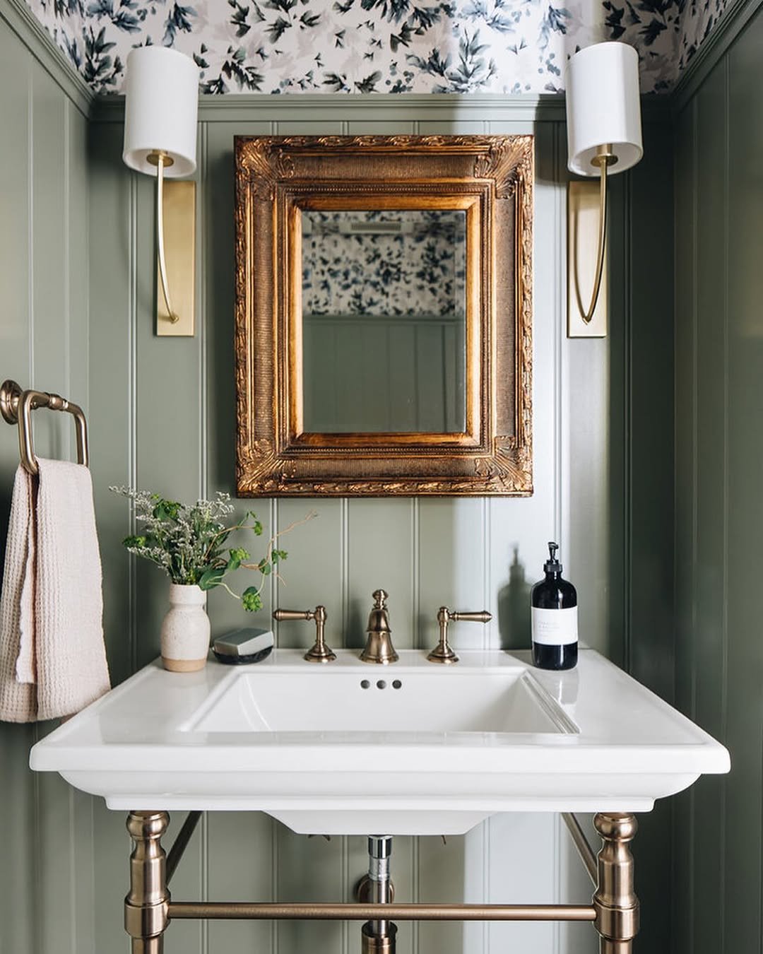 There’s something about this soft sage paneling mixed with that ornate gold mirror—it just feels effortlessly refined. The brass fixtures add warmth without overpowering the space, and everything feels balanced in that quiet, confident way.