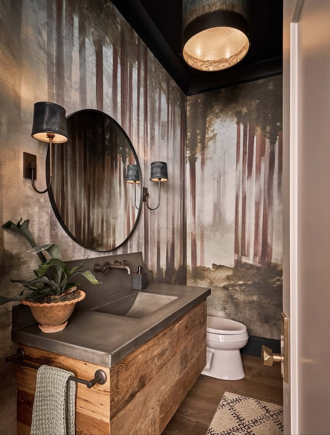 This one is moody in a completely different way. That forest-inspired wallpaper paired with raw wood and concrete textures gives it a grounded, almost cabin-like feel.