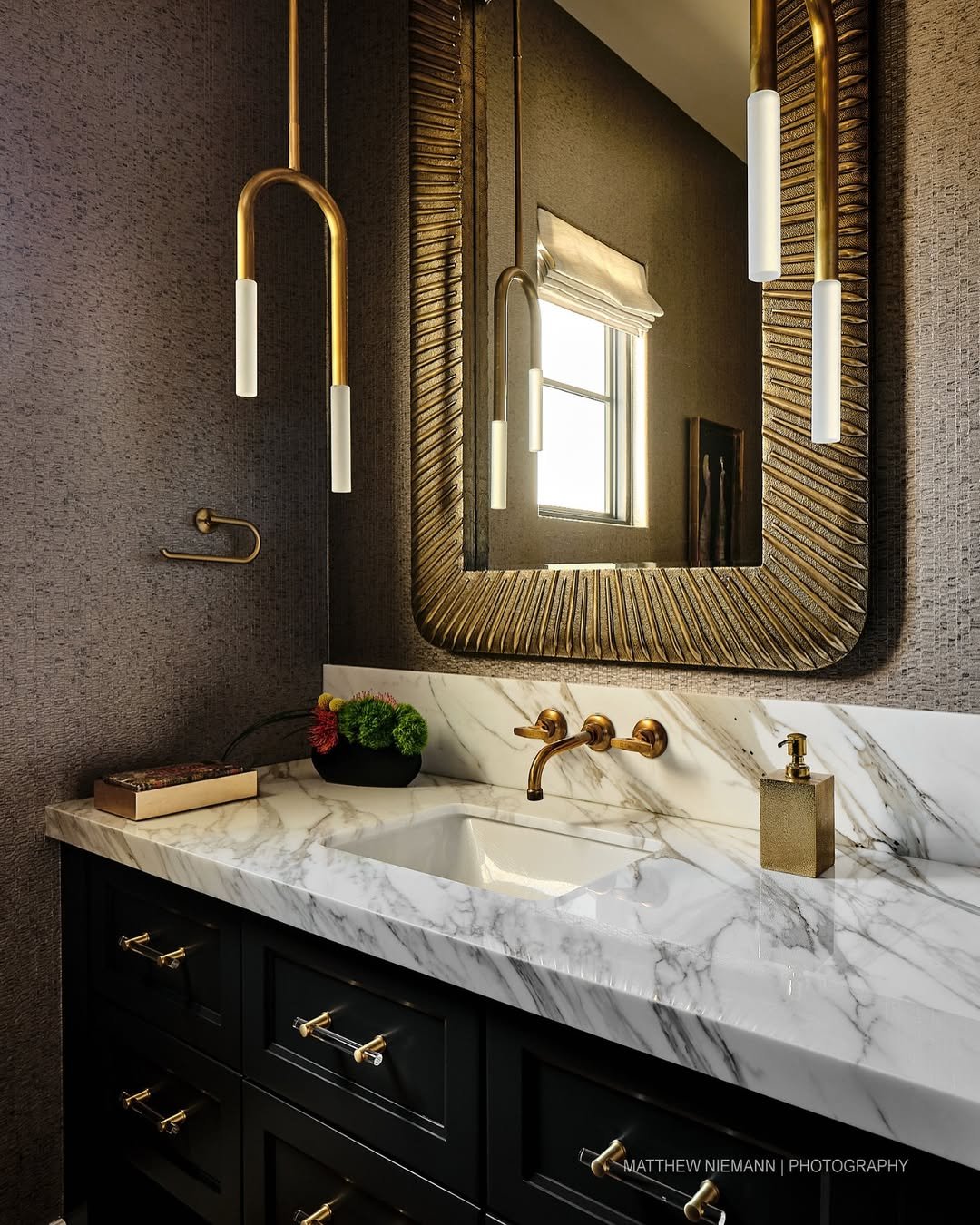 Everything here feels intentional—from the oversized mirror to those sculptural pendant lights. The marble countertop and deep cabinetry add just enough weight to balance the shine.