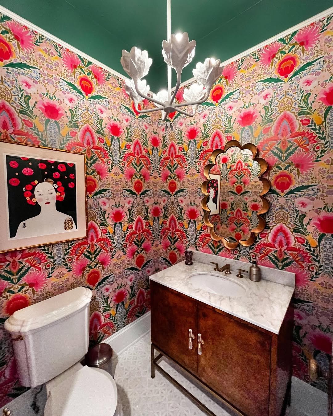 This one doesn’t hold back. The vibrant wallpaper, rich colors, and statement lighting turn this into a full-on experience, not just a bathroom.