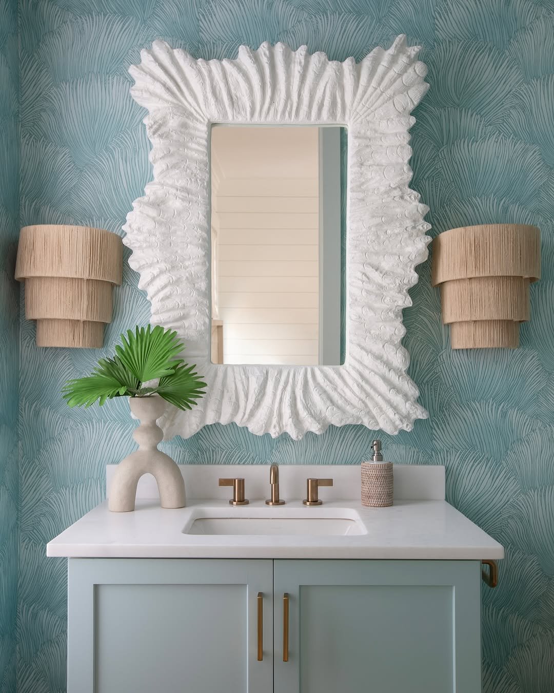 This one feels like a breath of fresh air. The textured wallpaper, soft blue tones, and that statement mirror create a calm, coastal-inspired vibe without going cliché.