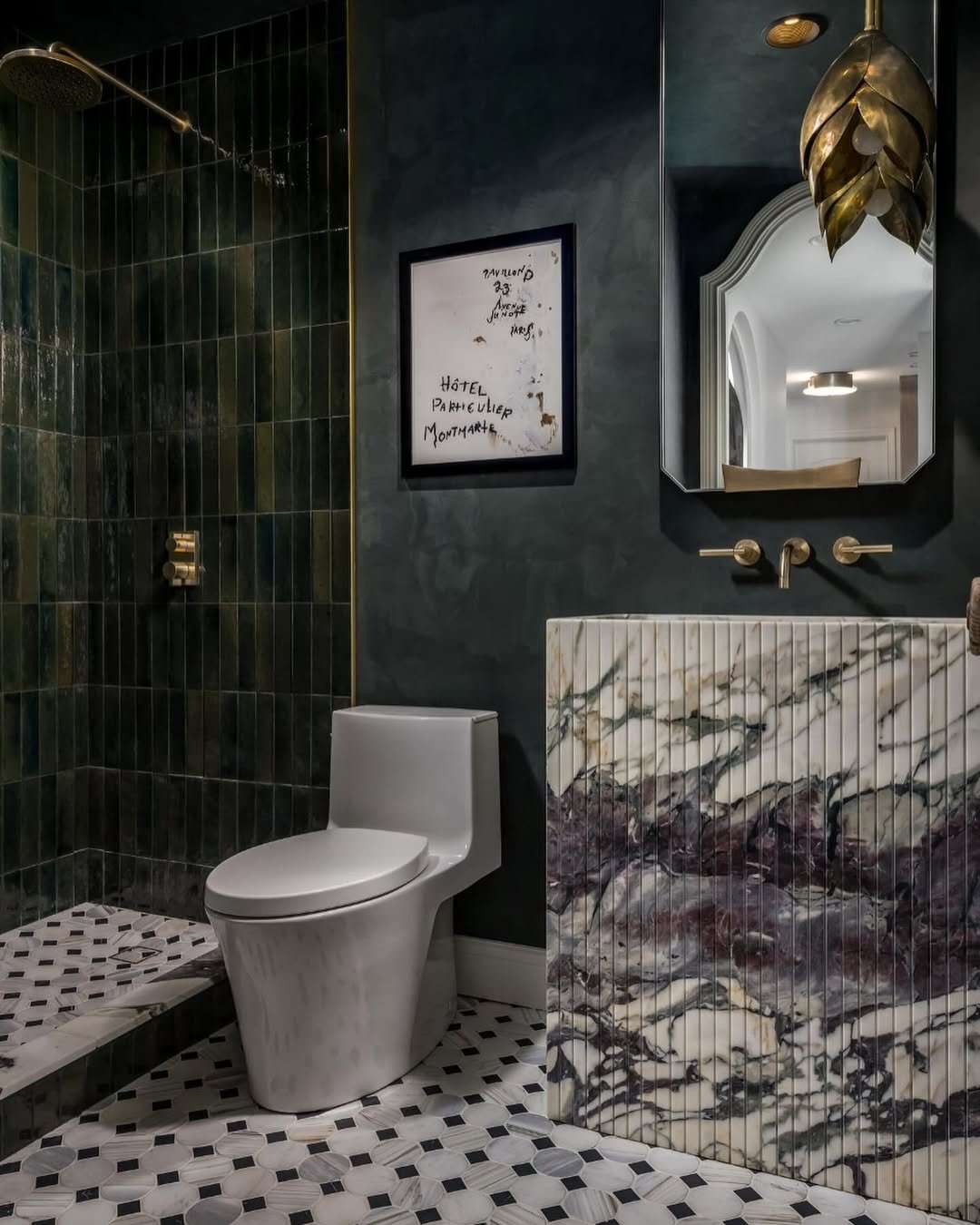 This is full-on luxury mode. The dramatic marble, dark green tones, and sculptural lighting create a space that feels almost cinematic.