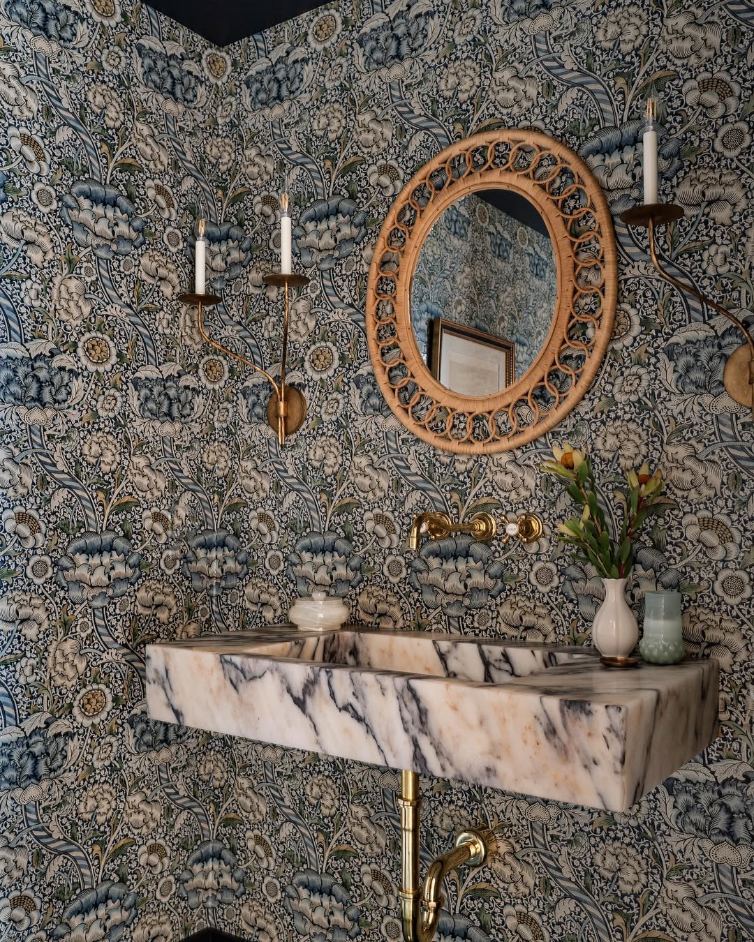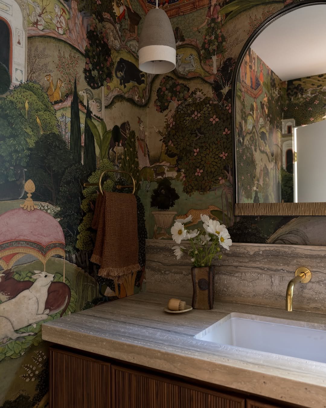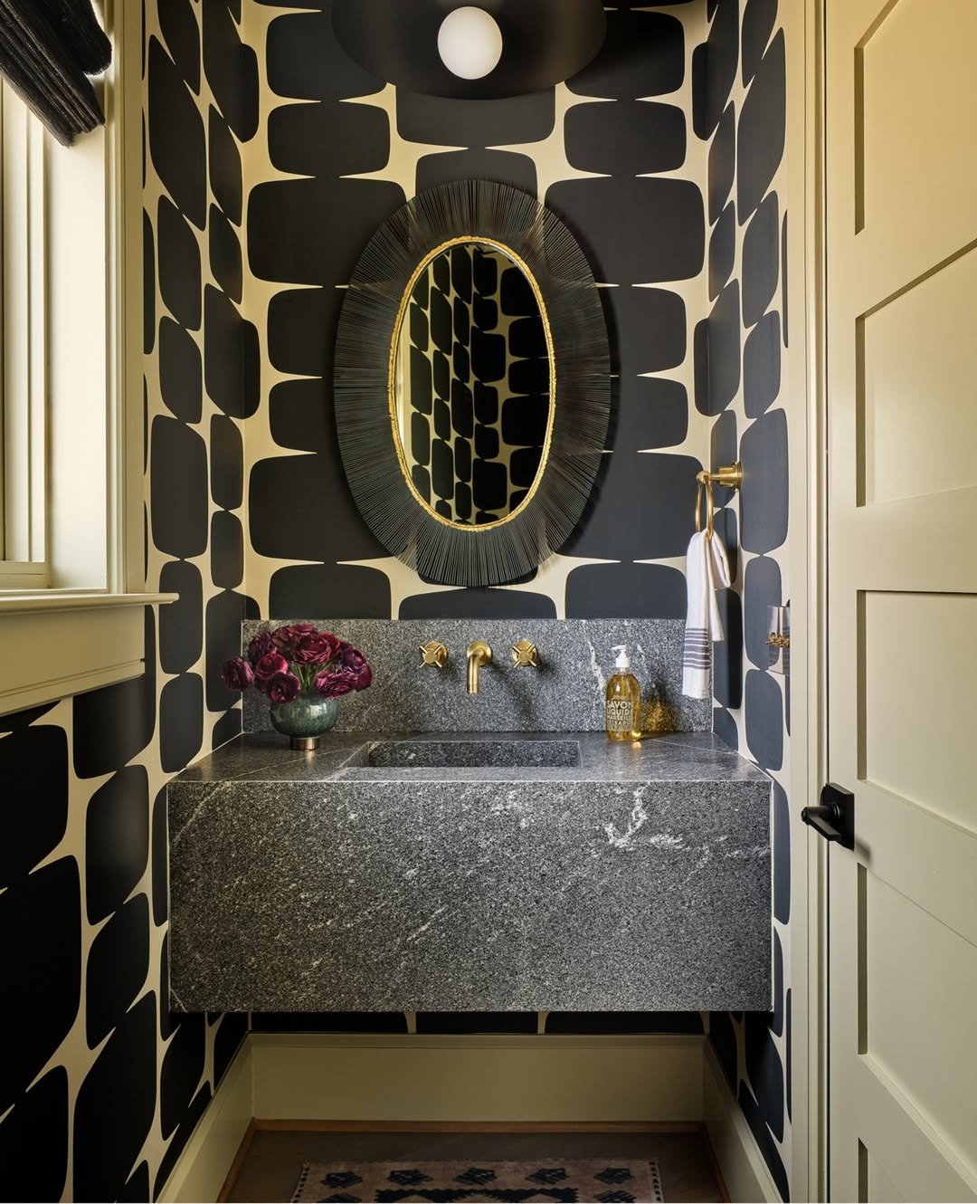 This one leans into shape and texture in the best way. The curved mirror, bold wallpaper, and solid stone sink create a space that feels almost gallery-like.