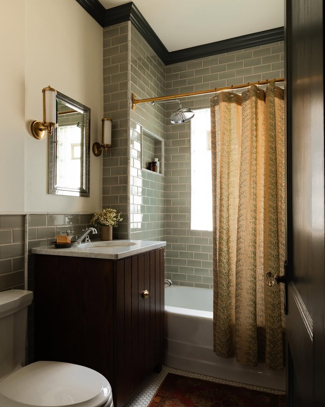 This one feels like stepping into a perfectly preserved moment. The soft green subway tiles, warm brass fixtures, and that patterned curtain bring in a quiet, nostalgic charm that just works.
