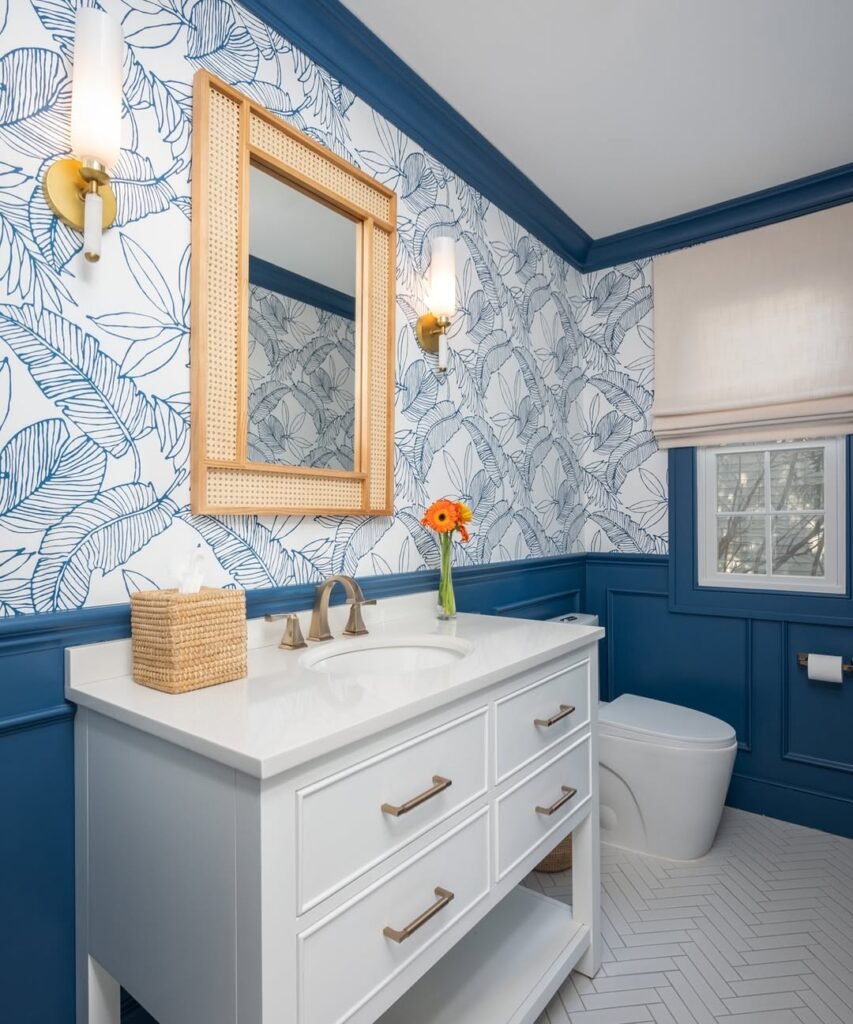 Light, airy, and just a bit playful. The blue botanical wallpaper paired with crisp white cabinetry keeps things feeling fresh without being too safe.